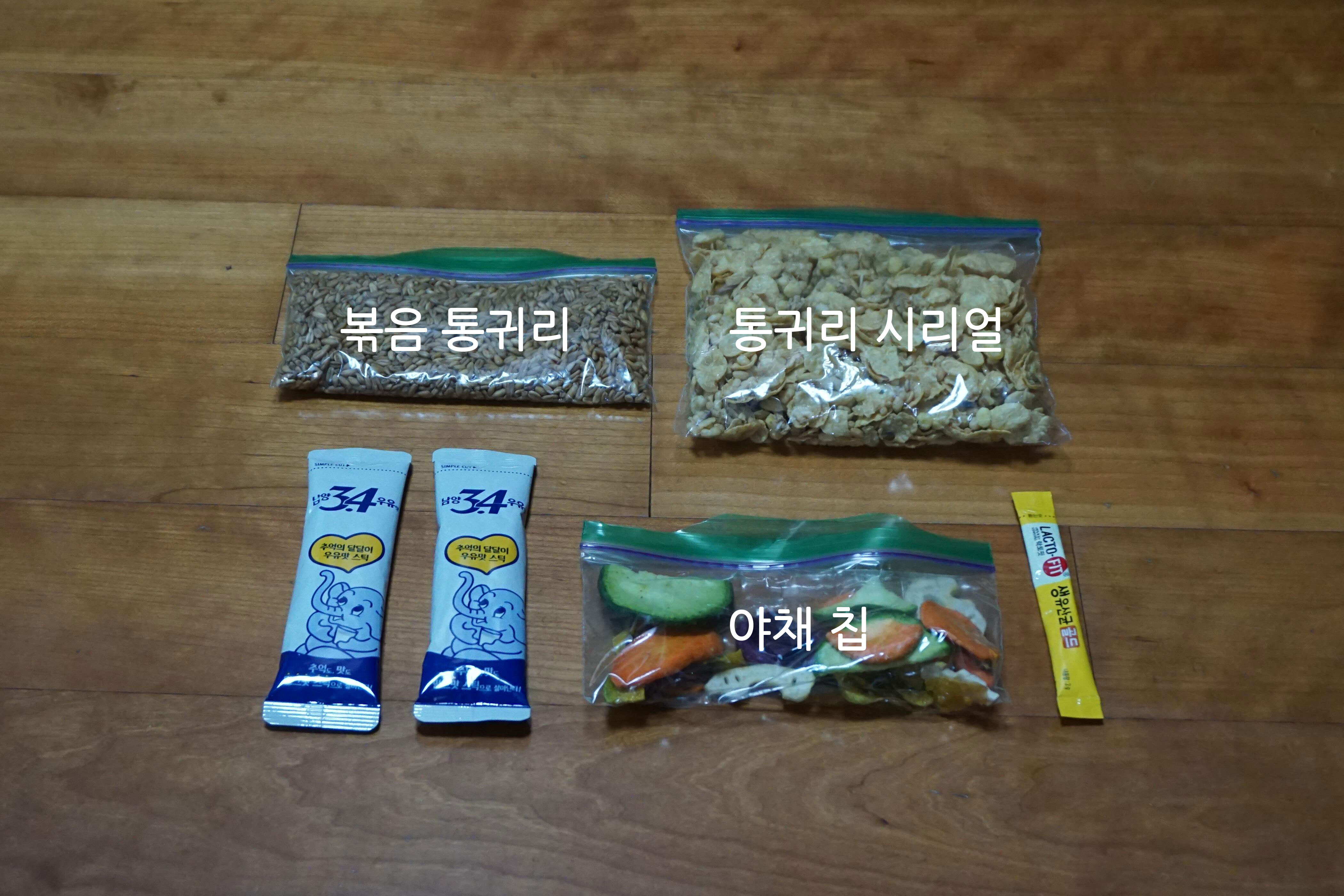 음식 포장지 무게와 부피를 줄이고 보관이 용이하도록 각 음식을 미니 또는 소형 지퍼백에 담은 후 각 끼니별로 중형 지퍼백에 담아 그날그날 끼니별로 꺼내 먹기 좋게 포장하여 번거롭지 않게 하였습니다.