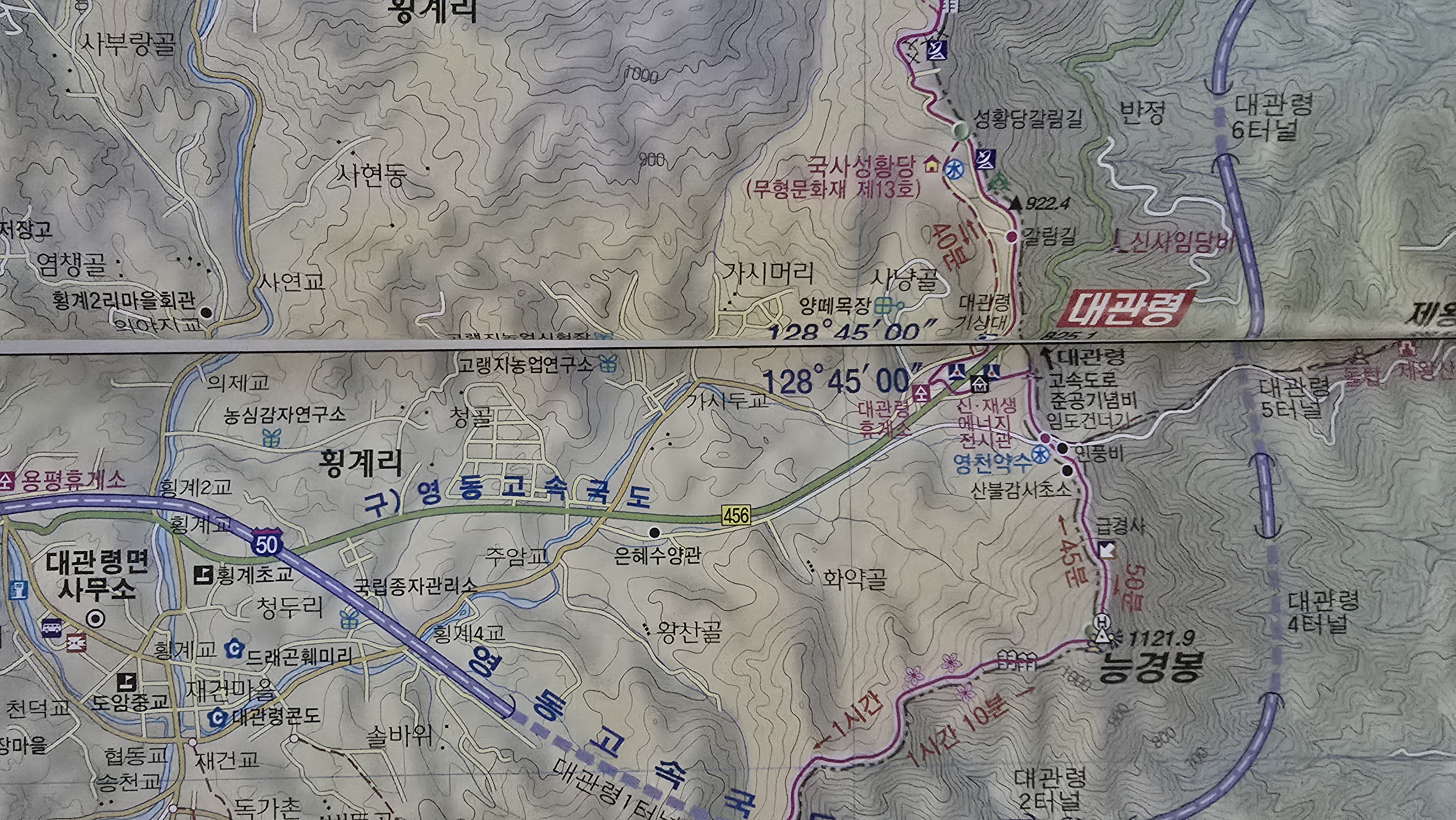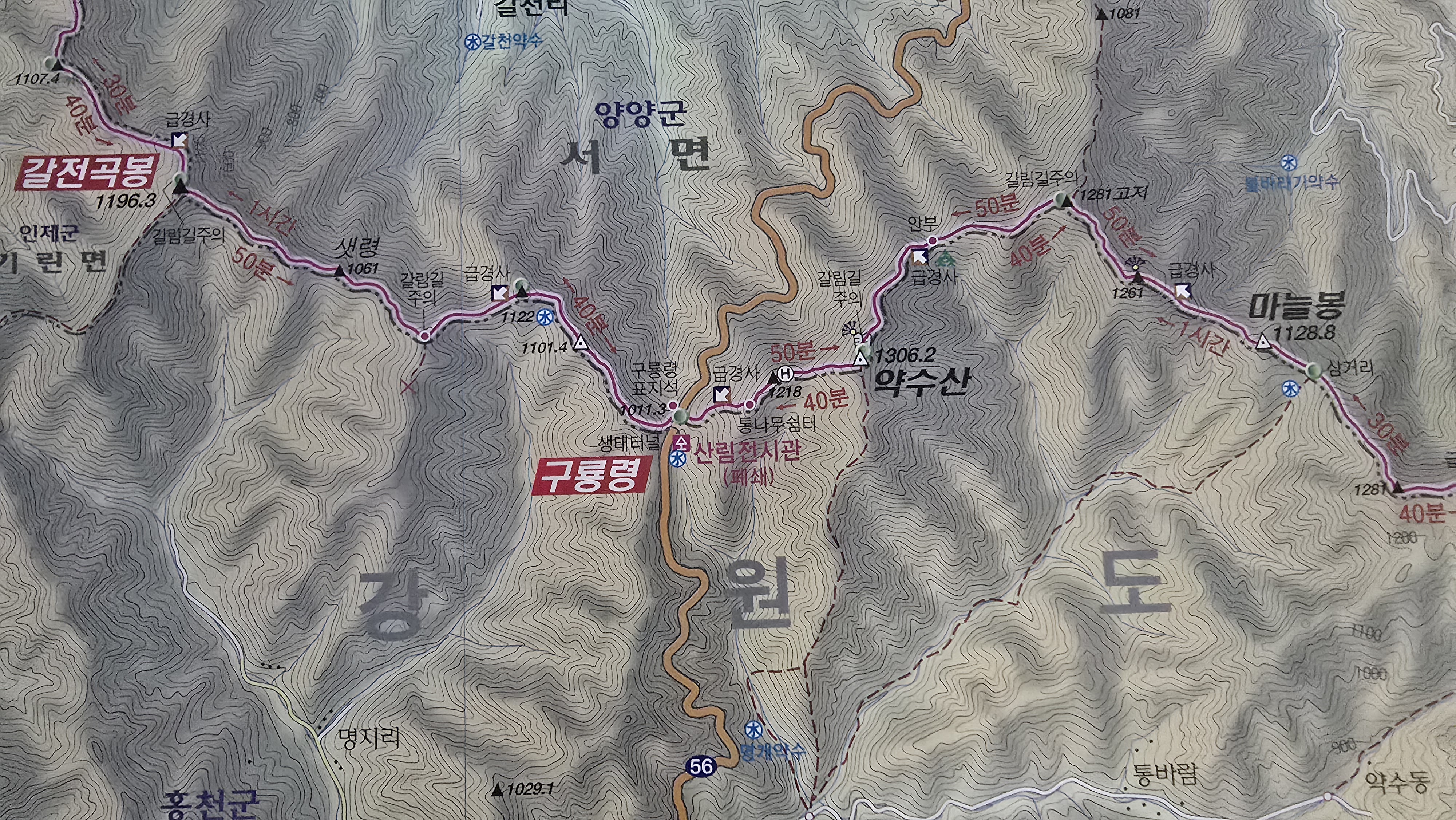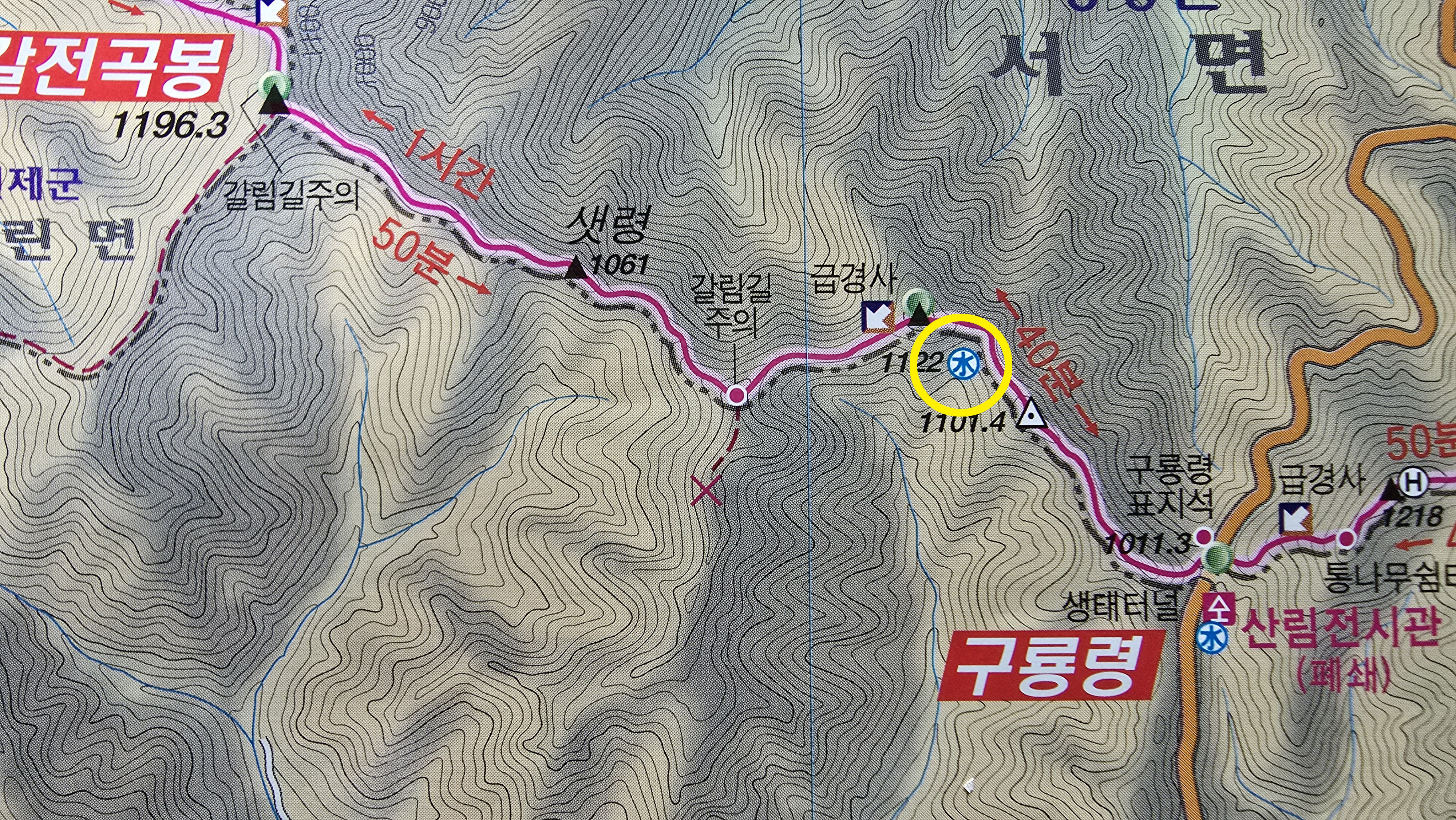 방태천3교-1.6-작은미아치골 상류(계곡수)-4.8-연가리골(우측170m계곡수)-3.6-왕생골삼거리(우측110m계곡수)-3.4-갈전곡봉-3.6-구룡령(우측 3.5km지점 용규네 휴게소)-1.1-약수산-3.1-마눌봉-1.8-응복산-1.5-만월봉-3.0-신배령(우측190m계곡수)2.4-두로봉-4.0-차돌백이-2.7-동대산-1.7-진고개(휴게소 식수)-4.0-노인봉-3.7-소황병산-(소황병산에서 20분가량지나 안부 좌측 10m계곡수)4.5-매봉-4.1-곤신봉-2.5-선자령-1.6-새봉-2.8-대관령(휴게소 식당 식수)