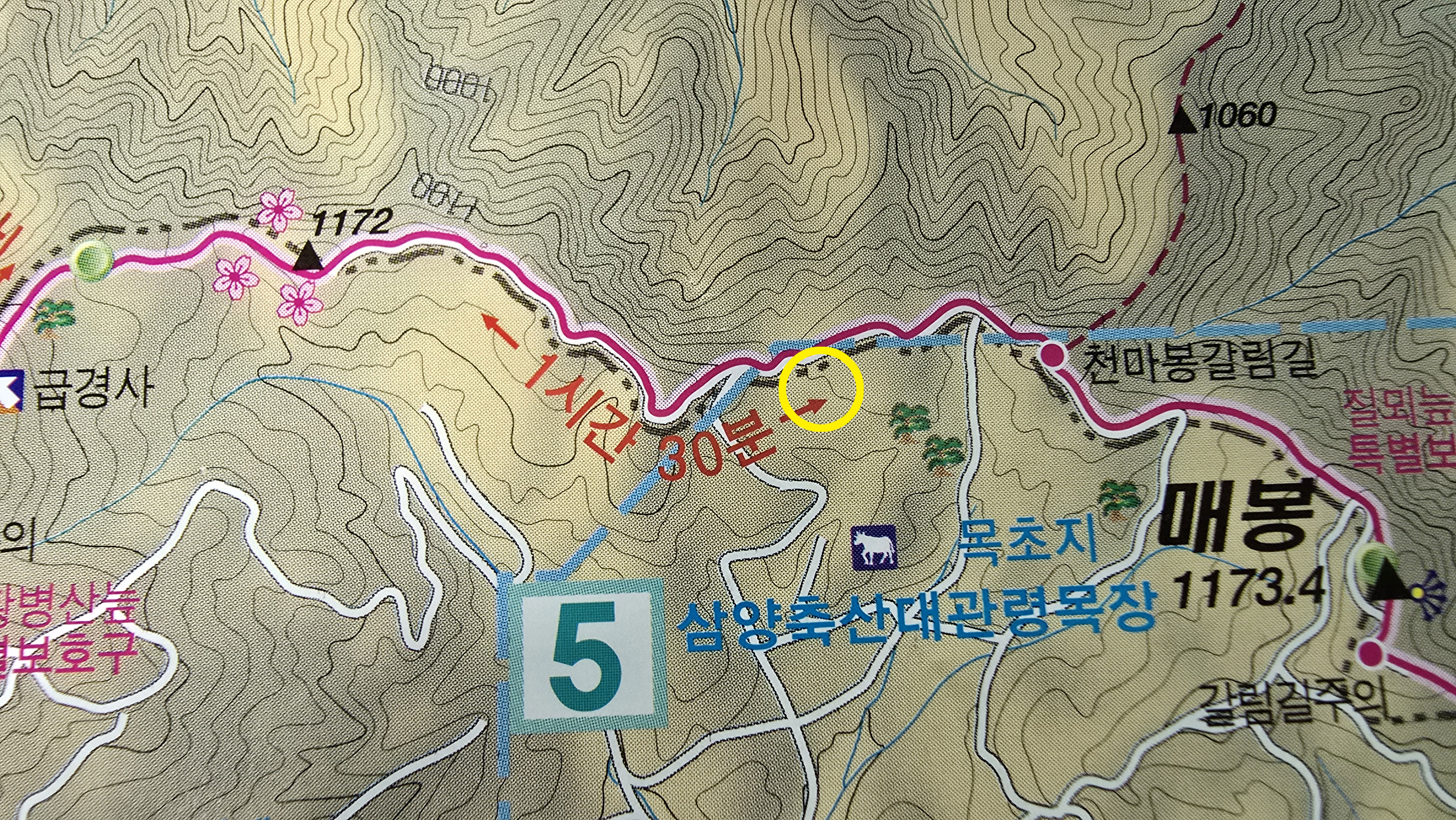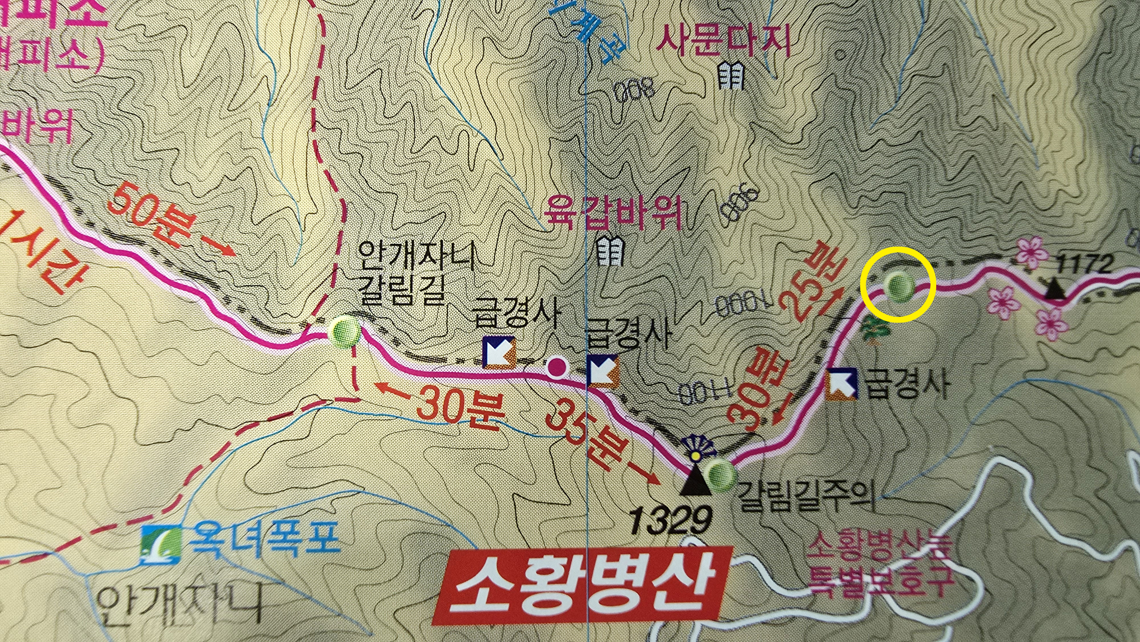매봉 전 안부 우측, 초원 방향 80m 지점: 계곡수 (갈수기에는 물이 고여 식수로는 부적합)
