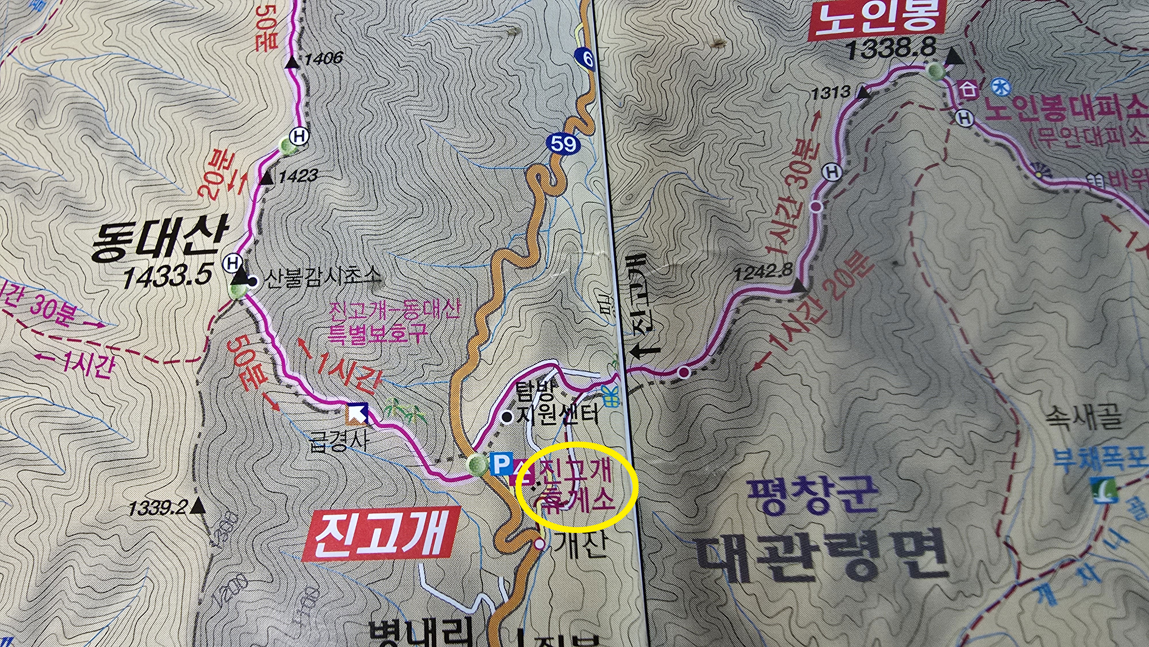 진고개 정상 휴게소 - 진부역: 관내 버스 또는 진부 택시 이용 (033-335-1050, 미터 요금 약 30,000원)