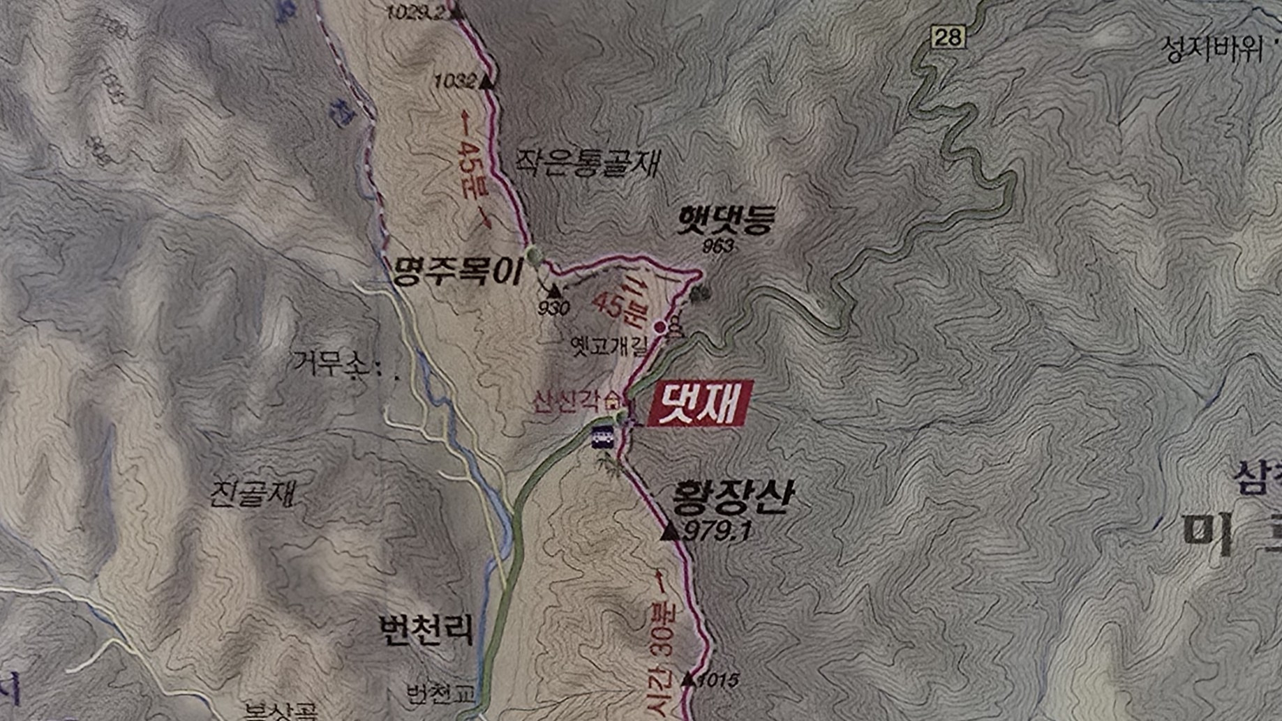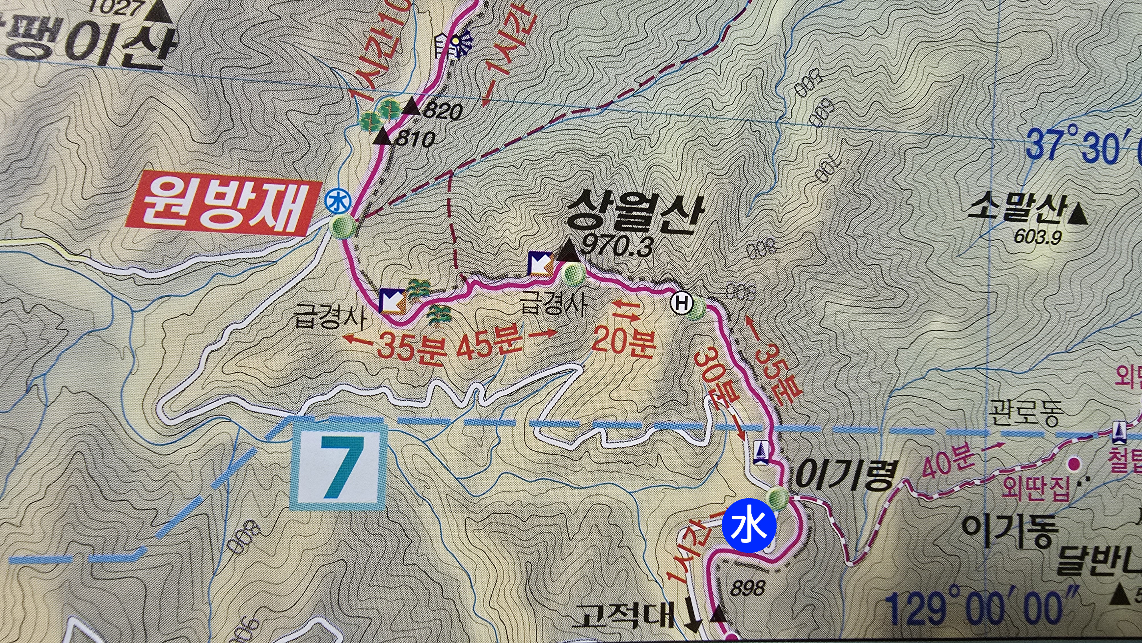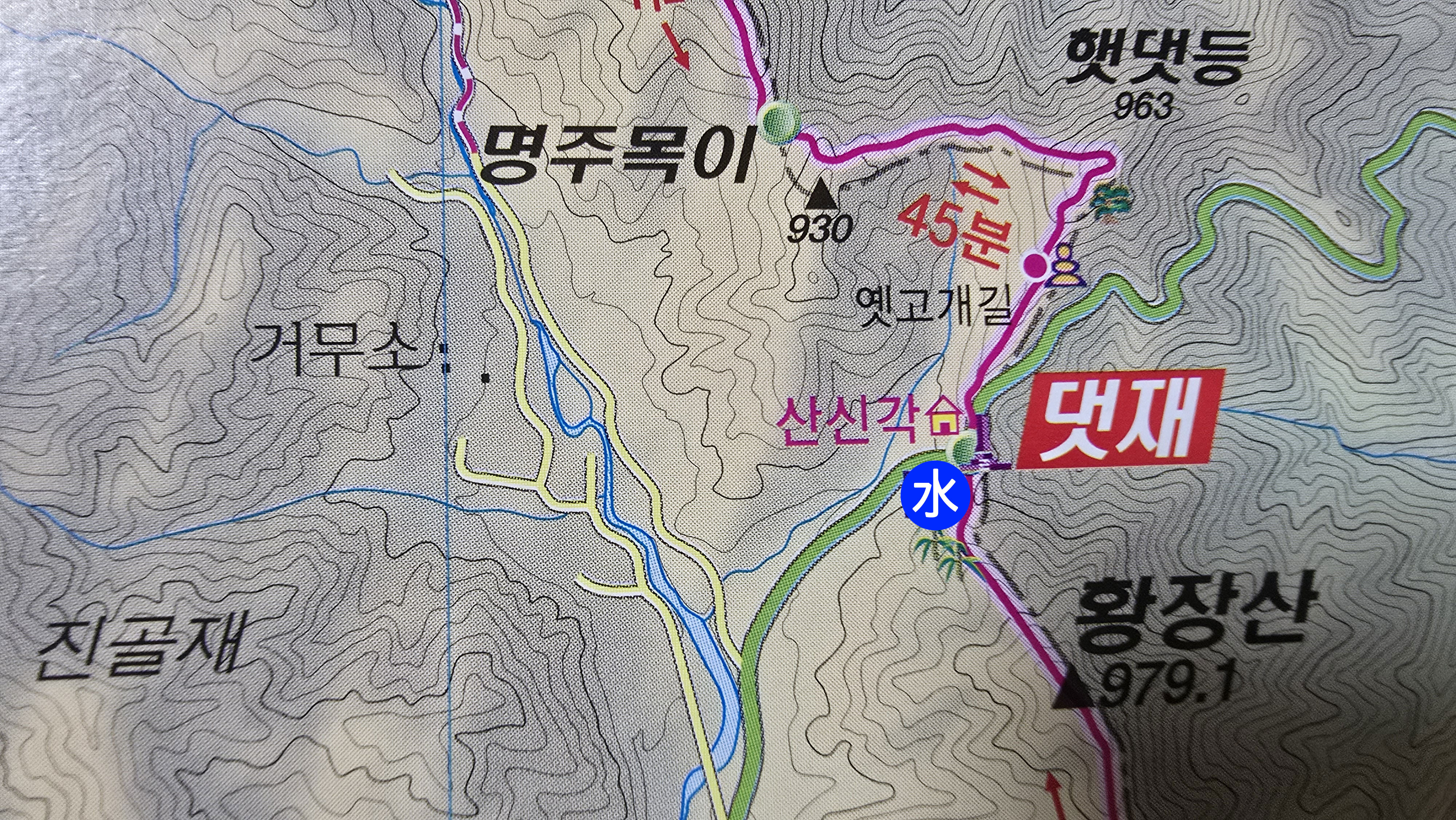 원방재: 우측 20m 하산 → 시멘트 임도 따라 30m 지점 풍부한 계곡수