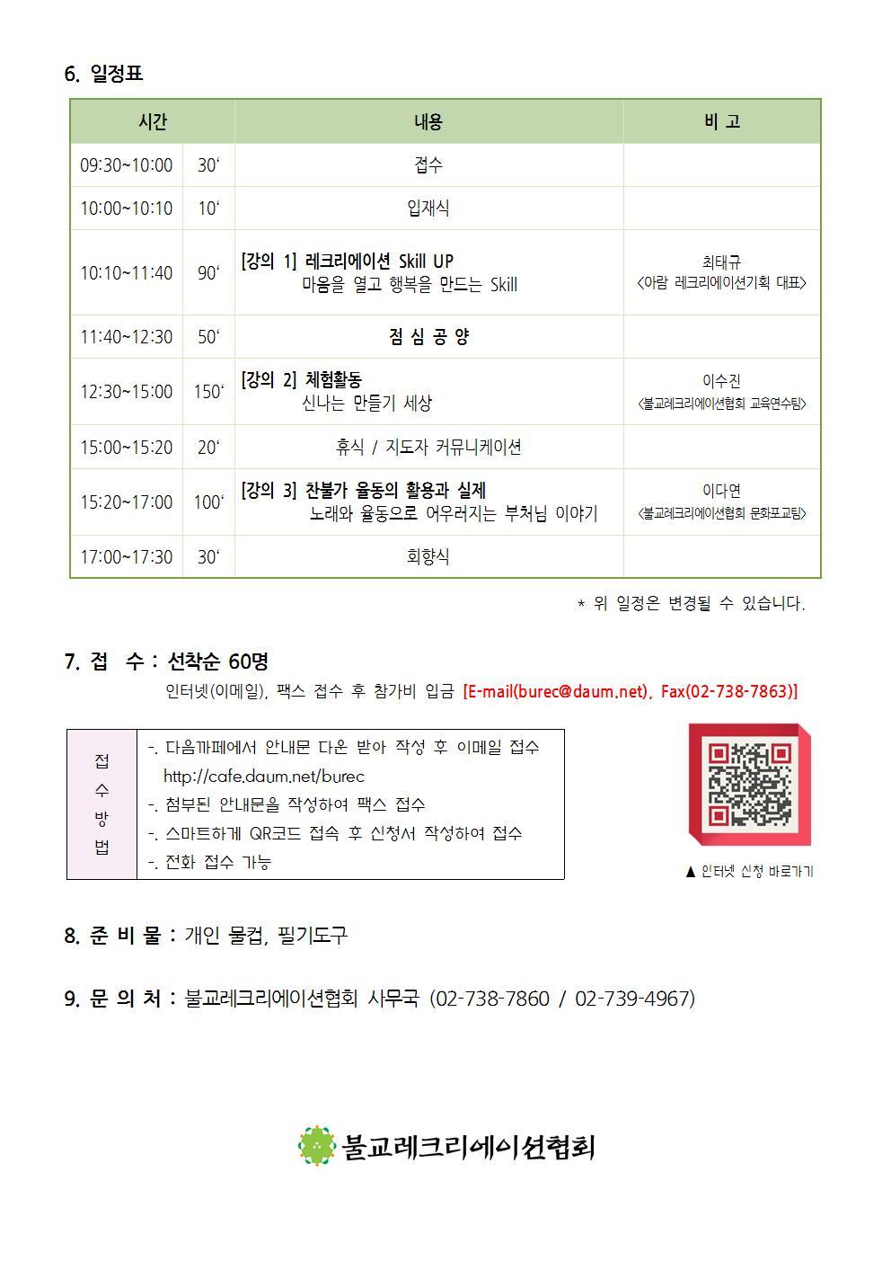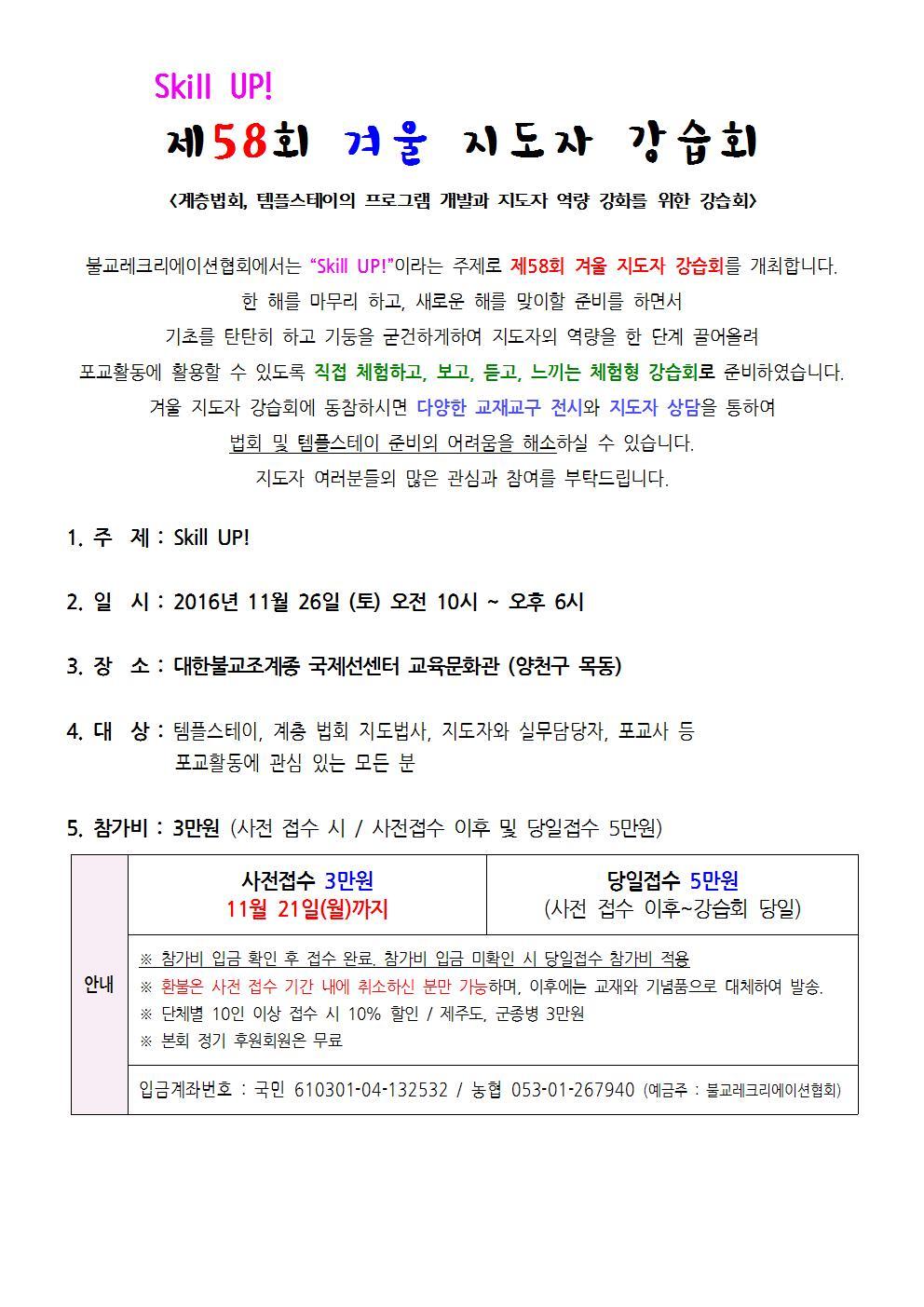 [스크랩] 제58회 겨울지도자강습회 개최 안내 작성자젊은태양|작성시간16.11.10|조회수15 목록 댓글 0 글자크기 작게가 글자크기 크게가 모바일 신청서 바로가기https://docs.google.com/forms/d/e/1FAIpQLSd9kD-YfrBUFS1v24DMQ4m71KBIlMeSIUymFgfUsPVvZH7uRQ/viewform?usp=send_form<공문 및 안내문, 신청서는 첨부파일을 참조해 주시기 바랍니다> 발송 2016-27호 제58회 겨울 지도자 강습회 안내의 건.pdf 제58회 겨울지도자 강습회 안내문.pdf 제58회 지도자 강습회 신청서.hwp 첨부파일첨부된 파일이 5개 있습니다. jpg 파일 제58회 겨울지도자 강습회 안내문001.jpg 다운로드 jpg 파일 제58회 겨울지도자 강습회 안내문002.jpg 다운로드 pdf 파일 발송 2016-27호 제58회 겨울 지도자 강습회 안내의 건.pdf 다운로드 pdf 파일 제58회 겨울지도자 강습회 안내문.pdf 다운로드 hwp 파일 제58회 지도자 강습회 신청서.hwp 다운로드 다음검색 스크랩 원문 : 불교레크리에이션협회 현재 게시글 추가 기능 열기 북마크 공유하기 신고 센터로 신고 댓글 댓글 0 댓글쓰기 답글쓰기 댓글 리스트