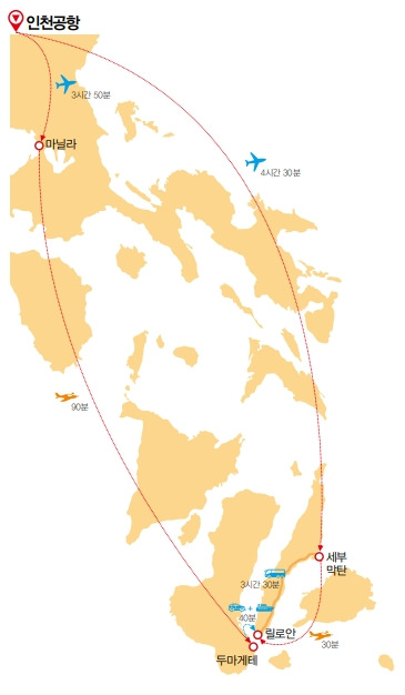 • 인천 → 마닐라공항 → 두마게테공항 → 시불란항 → 릴로안