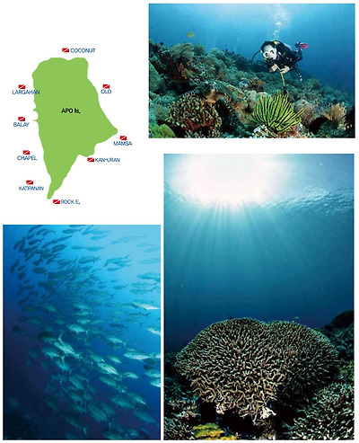 아포섬이나 스퀴홀섬 같은 장거리 지역의 다이빙 사이트도 이곳에서 데이트립(Day Trip)으로 다이빙이 가능하다.