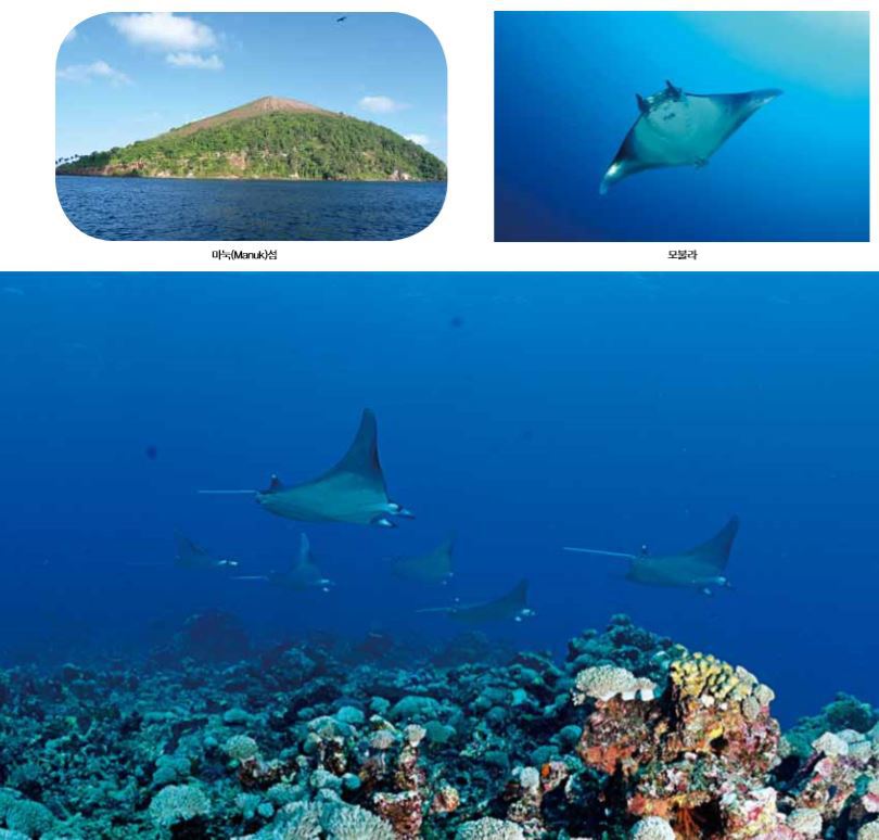 새(Bird)라는 의미인 마눅(Manuk)섬에는 다양한 새가 많이 서식하고 있다. 새들은 수시로 섬과 바다사이를 드나들며 먹이사냥을 하고 있다. 지금도 섬의 구석구석에서는 황을 내뿜고 있는 활화산이며 무인도이다. 바닷속 슬로프에는 많은 항아리 산호(Barrel Sponge)를 비롯하여 다양한 산호초가 어우러져 있다.