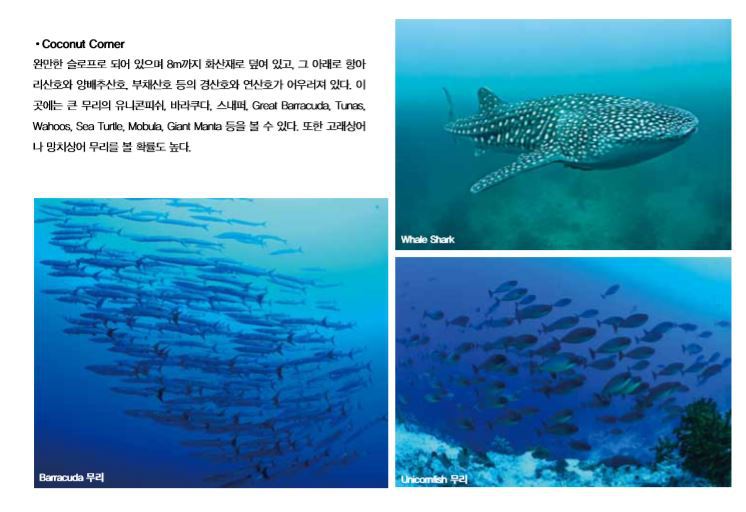 아리 스폰지, 경산호 등이 어우러져 있다. 이곳에서는 Trevally 무리, Great Barracuda,