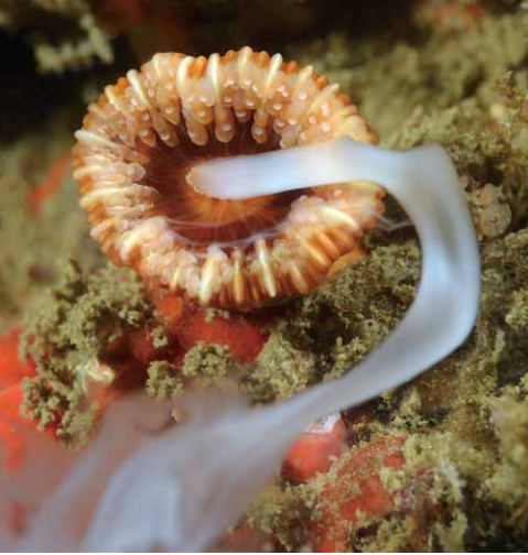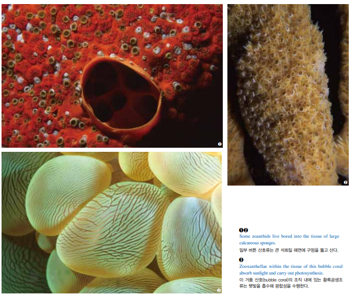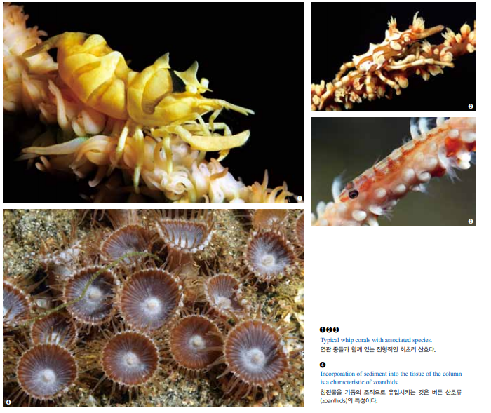회초리 산호(whip coral, Cirrhipathe)는 게, 망둥이, 새우 등 여러 종들을 맞이한다. 이들 종은 사진에 담기가 어려운데, 숨바꼭질 을 하면서 위협이 임박하면 산호의 반대편으로 재빨리 퇴각하기 때문이다. 버튼 산호류(zoanthids)는 버튼 산호목(Zoantharia)에 속하고 산호초, 심해와 세계적으로 많은 기타 해양 환경에서 흔히 발견되 는 자포동물이다. 이들 해양생물은 다양하고 서로 다른 군체 형태 를 형성하며 수많은 색상을 띄고 있다. 일부 종은 다육질의 주근 (走根, stolon)에 의해 기질에 부착된 개체 폴립으로 발견되는 반 면, 다른 일부는 수많은 개체로 형성되어 있다. 버튼 산호류는 기타 군체 산호충류 및 연산호와 구분할 수 있는 데, 그들은 모래와 기타 작은 물질을 자신의 조직으로 유입시켜 보다 견고한 구조물을 가지도록 돕는 특성을 지니고 있다.