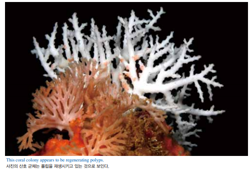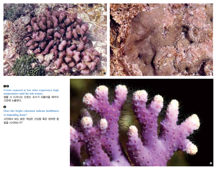 내성이 생긴 비슷한 개체군들이 카리브해, 미국령 사모아와 이라크 에서 발견되고 있다. 이러한 관찰들은 자연 선택의 증거다. 이 경우 에 고온에 살아남게 해주는 유전자를 지닌 자손은 살아서 번식해 자 신의 놀라운 능력을 후대에 물려준다. 이런 유전자가 없는 자손은 그저 사멸해 그 개체군의 유전자 풀에서 자신의 특성을 지운다. 각 각의 새로운 세대는 점점 더 강해진다. 최근의 한 기사에 따르면 인간은 건강한 산호초보다 예쁜 산호초를 선호해 산호에 대해 비현실적인 미적 기준을 가지고 있다고 한다. 산 호초의 강렬한 이미지는 고급 여행 잡지에 등장하는 인기물이다. 네 온 산호의 소용돌이치는 변화무쌍한 모습을 보면 많은 사람들은 ‘예 쁜’이란 말은 또한 ‘건강한’이란 말을 의미하리라고 믿게 된다. 그러 나 일부 생물학자들은 산호가 형광 색조로 변하면 흔히 보다 불길 한 뭔가가 작용하고 있다고 생각한다. 연구에 의하면 밝은 색상으로 변하는 것은 죽음의 징후일 수 있다고 한다. 밝은 색상으로 전환되 는 것은 백화 현상의 초기 단계에서 흔히 관찰된다.