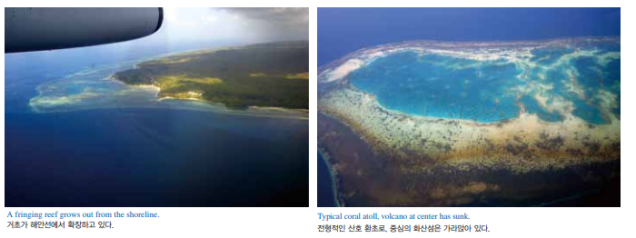 대개 태평양의 화산섬들은 그 밑의 해양판이 섬을 화산의 열 공급원 으로부터 멀어지게 하면서 결국 붕괴되거나 가라앉는다. 이럴 경우 에 섬이었던 곳은 이제 고리 모양으로 석호를 둘러싸는 모습이 된 다. 그러면 이러한 섬을 ‘환초(環礁, atoll)’라고 한다. 소시에테 제도(Society Islands, 남태평양 중부에 있는 프랑스령 제 도)에 있는 투아모투 제도(Tuamotu Archipelago)와 같은 지역들 은 수백 개의 산호 환초로 이루어져 있다. 산호 백화(coral bleaching)는 우리가 현재 세계적으로 목격하고 있 는 환경 변화와 함께 심각한 생태학적 사안이 되었다. 산호는 온도, 빛 또는 영양분과 같은 조건들이 변화해 스트레스를 받으면 자신의 조직에서 사는 공생 조류를 내쫓아 완전히 흰색으로 변한다.