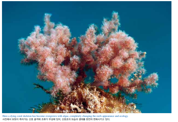 일차 생산력을 담당하는 기타 군락도 있지만, 산호는 그들을 모 두 능가한다. 좀 더 차가운 온대 해안을 따라 발견되는 켈프 군락 은 연간 제곱미터당 최대 1,900그램의 탄소를 전환한다. 민물 습 지와 농경지는 연간 제곱미터당 최대 1,800그램의 탄소를 처리한 다. 연구에 따르면 산호는 연간 제곱미터당 2,250그램의 탄소를 전환한다. 이러한 산호는 생명을 지탱하는 산소를 생성할 뿐만 아니라 생태학적으로 해양 산성화를 막는 투쟁에서 일선 병사의 역할도 한다. 그 모든 이산화탄소가 산 대신에 산소로 변하기 때 문이다.