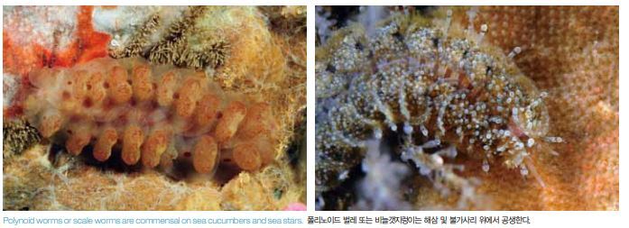 환형동물에서 또 다른 체절동물인 폴리노이드(Polynoids)는 비늘갯 지렁이(Scale worms)라고 한다. 속에 따라 이들 생물의 등 표면에 는 일련의 돌기 또는 나란히 배열된 깃털 같은 일련의 비늘이 있을 수 있다. 대부분의 종이 해삼 및 불가사리 위에서 공생한다.