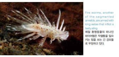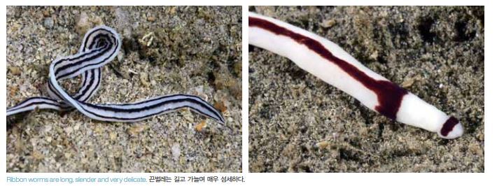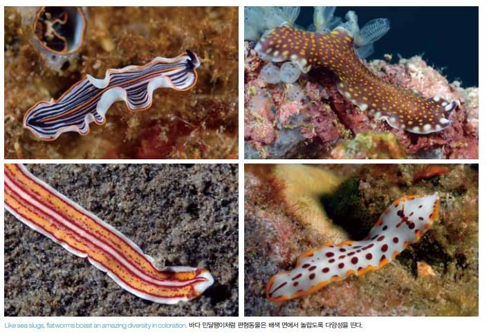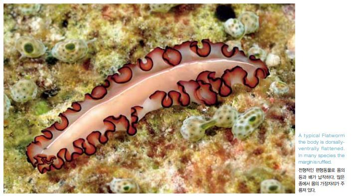해양 생물학자들에게는 해양 벌레들의 분류가 끔찍한 일인데, 아 직도 1,000여종이 서술되어 있지 않거나 잘 이해되지 않고 있기 때문이다. 생물학자들이든 다이버들이든 해양 벌레들이 놀라울 정 도로 다양하고 많은 종의 경우에 정말로 아름답다는 점에는 의견 을 같이한다. 해양 벌레들은 많은 문(門)으로 분류된다. 편형동물문(flatworms, Platyhelminthes), 유형동물문(Ribbon worms, Nemertea), 지렁 이와 관련이 있는 환형동물문(Segmented worms, Annelida)으로 시작해 계속되다가 성구동물문(Peanut worms, Sipuncula)과 의 충동물문(Tongue worms, Echiura)으로 끝난다. 여기서 환형동물 문은 세분되어 다모류(Polychaetes) 및 다모강(Polychaeta), 비늘 갯지렁이류(Polynoid worms), 석회관갯지렁이류(Feather Duster worms, Serpulidae) 및 꽃갯지렁이류(Fan worms, Sabellidae), 그리고 양목갯지렁이류(Fire worms, Amphinomidae)로 나뉜다. 편형동물은 벌레류에서 가장 원시적인 동물이다. 이들은 몸의 등 과 배가 납작하고 섬모라는 세모가 수많이 나 있어 바닥을 따라 미 끄러져 간다. 대부분의 종이 우아하게 유영을 한다.