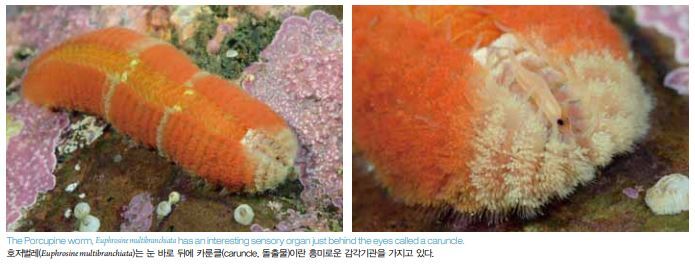 이상에서 주요 해양 벌레류들 가운데 보다 흔한 것들을 소개하 였으므로, 이제 흥미로운 벌레류를 얼마나 더 소개해야 할지 망 설여진다. 그러한 벌레류는 거의 무한하기 때문이다. 하지만 한 두 벌레류는 꼭 짚고 넘어가야겠다. 기이하고 이상하게도 호저벌레 또는 고슴도치벌레(Porcupine worm, Euphrosine multibranchiata)는 표영기(유영 번식기)와 저 서기를 모두 가진다. 강모는 몸의 양옆으로만 나 있어, 등의 중앙 을 따라 척추 뼈와 비슷한 것들이 드러난다. 이 벌레는 무척추동 물이기 때문에, 이렇게 척추 뼈의 모습을 하고 있다고 말하는 것 은 정확하지 않다. 이 종은 머리의 눈 바로 뒤에 흥미로운 기관 을 가지고 있다. 이 기관은 카룬클(caruncle, 돌출물)이라고 하 며 바다 민달팽이(Janolus)의 머리에 있는 기관과 비슷하다. 이 독특한 기관의 기능은 알려져 있지 않으나, 화학감각기인 것으 로 생각되고 있다. 학명에서 “multibranchiata”는 많은 아가미를 말하며, 이들 아가미는 손가락 모양의 새엽(gill filament, 아가 미의 구성단위)이 많이 있는 모습과 비슷하다.