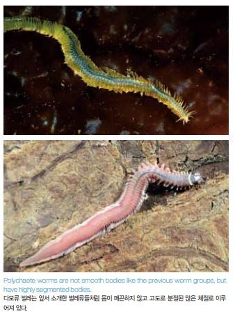 체절동물(Segmented worms)이라고도 알려져 있는 환형동물에 는 앞서 언급하였듯이 여러 부류가 있다. 첫 번째가 다모류(多毛 類, Polychaetes)다. 이들 벌레의 이름은 몸의 많은 체절 각각에 두 쌍의 측족(側足, parapodia)과 여기에서 돌출된 뻣뻣한 키틴질 털 인 강모(剛毛, setae)가 있는 해부구조를 하고 있는 데서 유래한 다. 이러한 강모가 있어 이들은 단단하거나 부드러운 기질에서 모 두 자유로이 이동할 수 있다. 일부 종은 유영 능력이 뛰어나기도 하다. 또한 강모는 방어기능을 할 수도 있다. 왕털갯지렁이(Bobbit worm)처럼 일부 종에서는 턱 및 입 구조물이 잘 발달되어 있다.