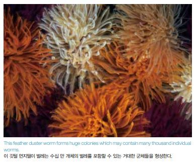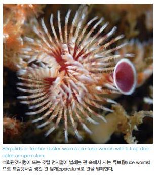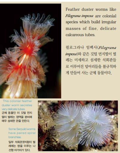 깃털 먼지떨이 벌레(feather duster worms)와 부채 벌레 (fan worms)로도 알려진 갯지렁이류의 공통점은 머리가 일련의 촉수 또는 아가미로 변형되어 있고 이들 기관이 원 형이면서 나선형 방식으로 배열되어 있다는 점이다. 이들 촉수는 섭식과 호흡에 사용한다. 깃털 먼지떨이 벌레인 석회관갯지렁이(Serpulids)는 점 액을 분비해 만든 석회관(calcareous tube) 속에서 산다. 부채 벌레인 꽃갯지렁이(Sabellids)는 기타 물질들로 만 든 관 속에서 사나, 절대 석회관은 아니다. 깃털 먼지떨이 벌레는 트럼펫처럼 생긴 촉수를 가지고 있는데, 관 덮개 (operculum)라고 하는 이 촉수는 이 동물이 관 속으로 후 퇴할 때 관을 밀폐할 수 있다.