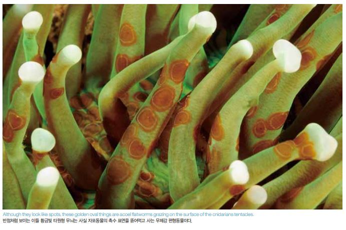 무체강 편형동물(acoel flatworms)은 매우 작으며 많은 산 호 및 말미잘 기질에서 발견된다. 이들은 숙주 조직의 점액 에 걸린 동식물군을 먹고사는 것으로 생각된다. 많은 종이 분절증식(fragmentation)이란 무성생식을 통해 번식한다. 다이버들은 이들을 그저 산호에 나 있는 점무늬 정도로 생 각하면서 지나친다.