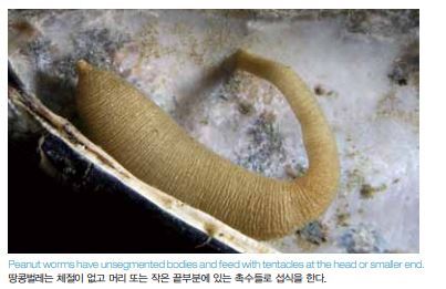 주요 해양 벌레류들을 살펴보면서 마지막으로 두 부류를 알아 볼 차례가 되었는데, 땅콩벌레(Peanut worms)라고도 하는 성 구동물(星口動物, Sipuncula)과 혀벌레(Tongue worms)라고 도 하는 의충동물(蟻蟲動物, Echiura)이다. 이 두 부류는 서로 밀접히 관련되어 있다. 둘 다 체절이 없다. 땅콩벌레에서는 몸 이 몸통과 외번 가능한 부분(구문부[口吻部], proboscis)으로 나뉜다. 이 구문부에는 닫히지 않은 고리 모양으로 촉수들이 배 열되어 있어 섭식에 사용한다. 혀벌레도 변형된 입인 구문이 있 어 섭식에 사용한다. 이 기관은 2엽으로(bilobed)으로 나뉘거나 나뉘어져 있지 않을 수도 있다. 두 벌레류는 모두 퇴적물 섭식동 물(deposit feeder)이다.