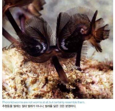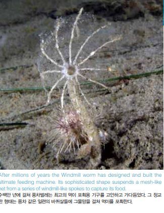 이제 형태가 너무도 독특해 해양 벌레들이 얼마나 다양하고도 흥미로울 수 있는지를 극명하게 보여주는 하나의 벌레를 소개 하면서 글을 마감하려 한다. 바로 풍차벌레(windmill worm) 는 해양 벌레들이 어느 정도까지 진화하였는지를 보여준다. 이 들은 거주할 관을 지어 체절로 이루어진 연약한 몸을 보호하면 서 표류하는 먹이를 포획하기 위한 구조물로 사용한다. 관의 꼭대기에는 바퀴살이 방사상으로 풍차처럼 펼쳐져 있어, 부유 물 섭식(suspension feeding)을 위한 그물망 역할을 한다. 망 이 가득차면 벌레는 관에서 나와 망에 걸린 먹이를 섭취한다.