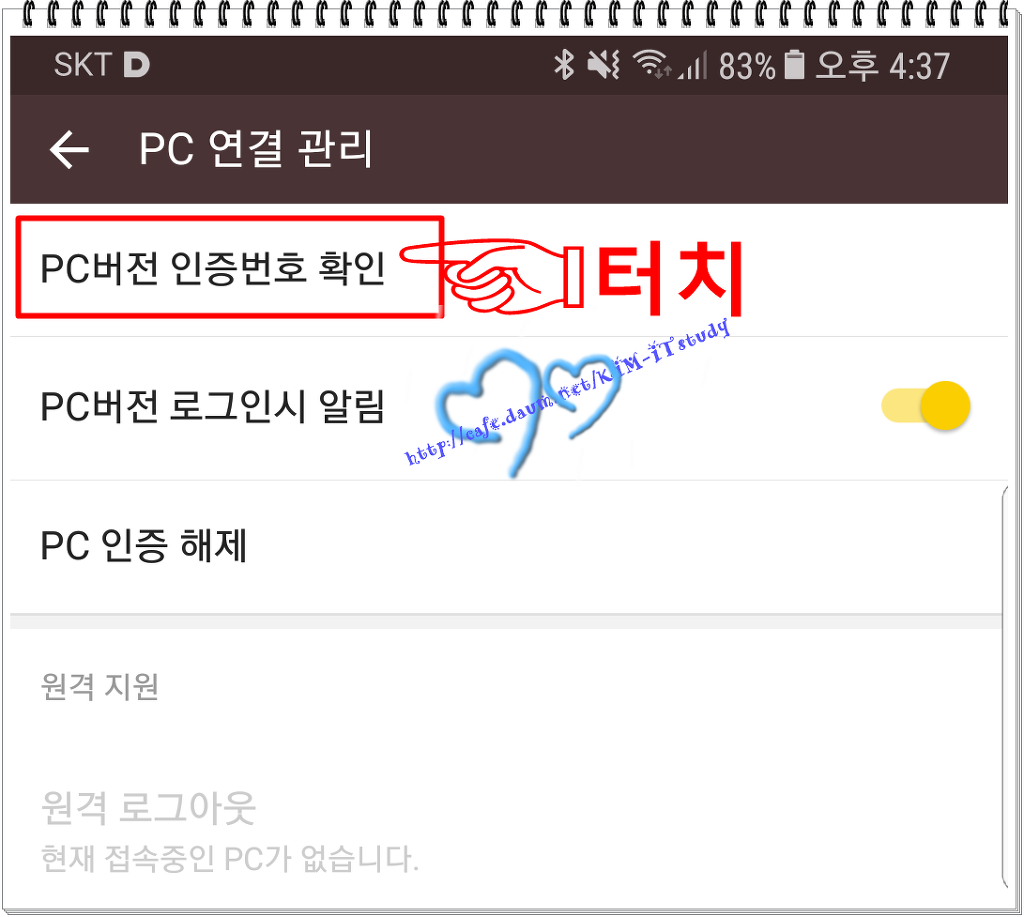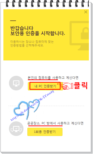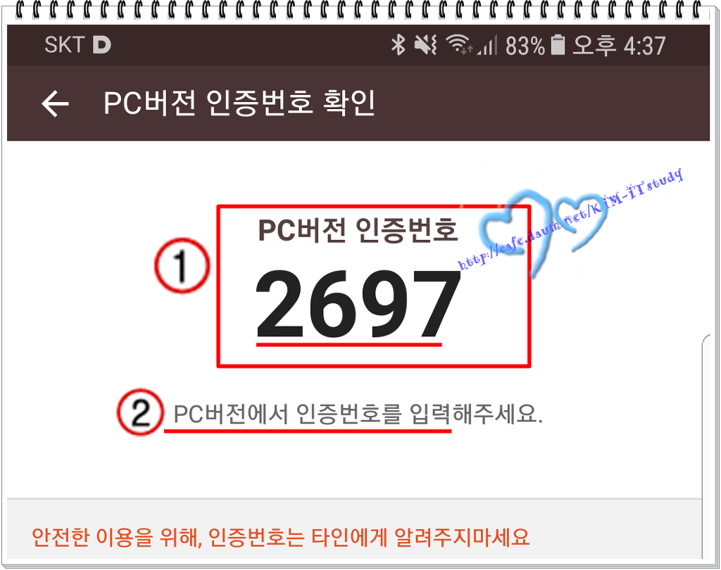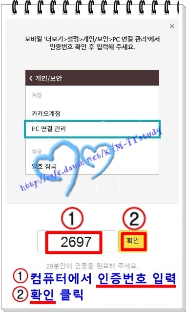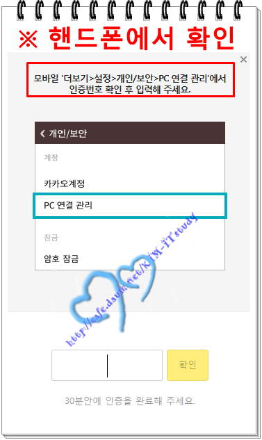 내 핸드폰에서 인증번호 확인후 PC에 입력 합니다.