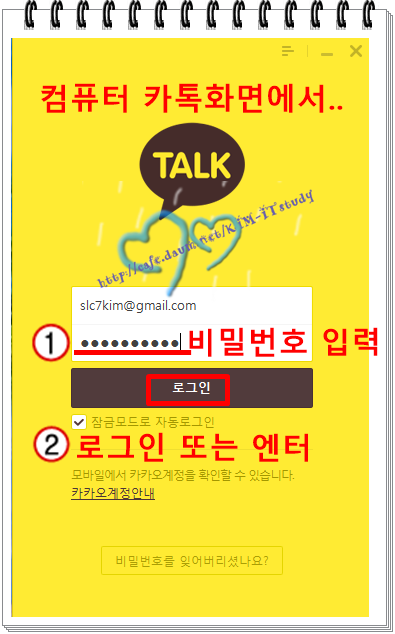 카카오톡계정 비밀번호 입력하고 로그인 합니다.