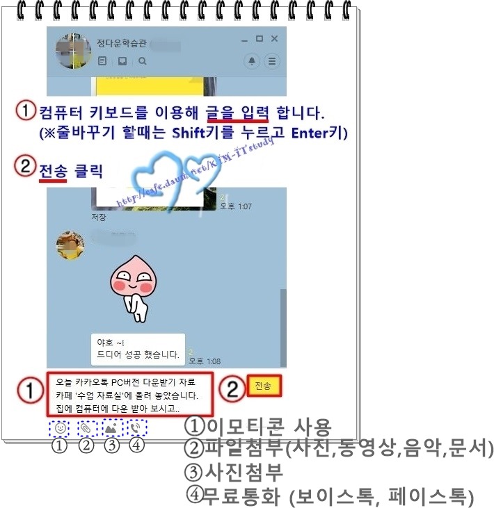 컴퓨터 키보드를 이용해 채팅과 파일첨부(사진,음악,동영상)을 하실수 있고,