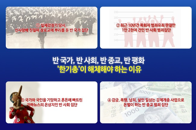 기독교는 하나님을 믿고 하나님의 말씀 따라 신앙하는 종교인데, 한기총은 하나님이 아닌 일본 신에게 절하고 찬양한 과거가 있는 단체입니다. 그뿐 아니라 성도들의 헌금으로 당시 일본에게 전쟁에 쓸 군수 물자까지 제공한 단체입니다.