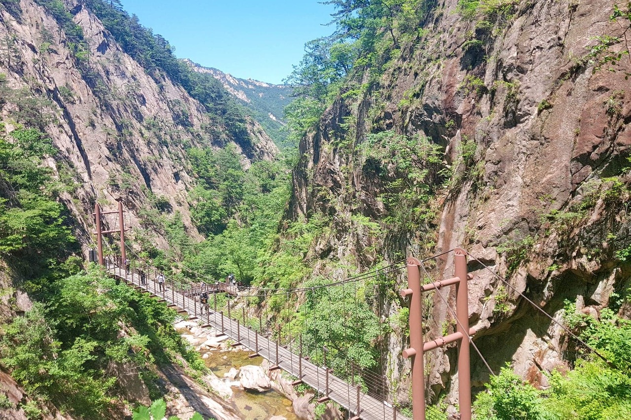 설악산의 비선대에서 대청봉으로 오르는 8km 구간에 펼쳐진 계곡이에요. 천불동이라는 이름은 계곡 양쪽의 기암절벽이 천 개의 불상이 늘어서 있는 듯한 형상이라는 데서 유래했어요. 설악산 대표 탐방코스로 특히 가을에는 단풍을 즐기러 온 여행객으로 붐비죠. 설악동 소공원에서 시작되는 탐방코스 중간에는 와선대, 비선대, 귀면암, 오련폭포, 양폭 등 빼어난 경관지가 이어져요. 양폭 대피소까지 소요 시간은 왕복 약 6~7시간이에요.