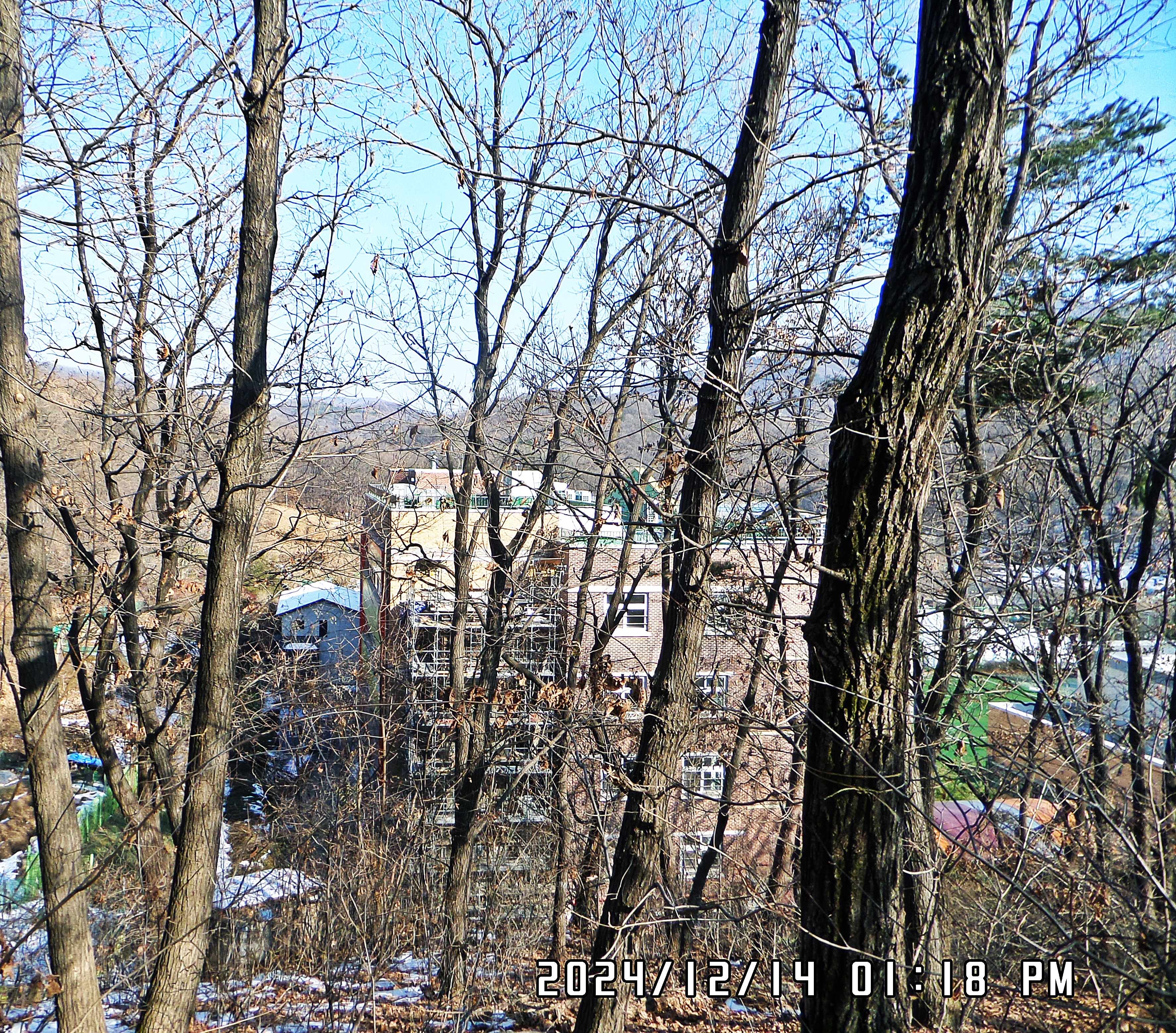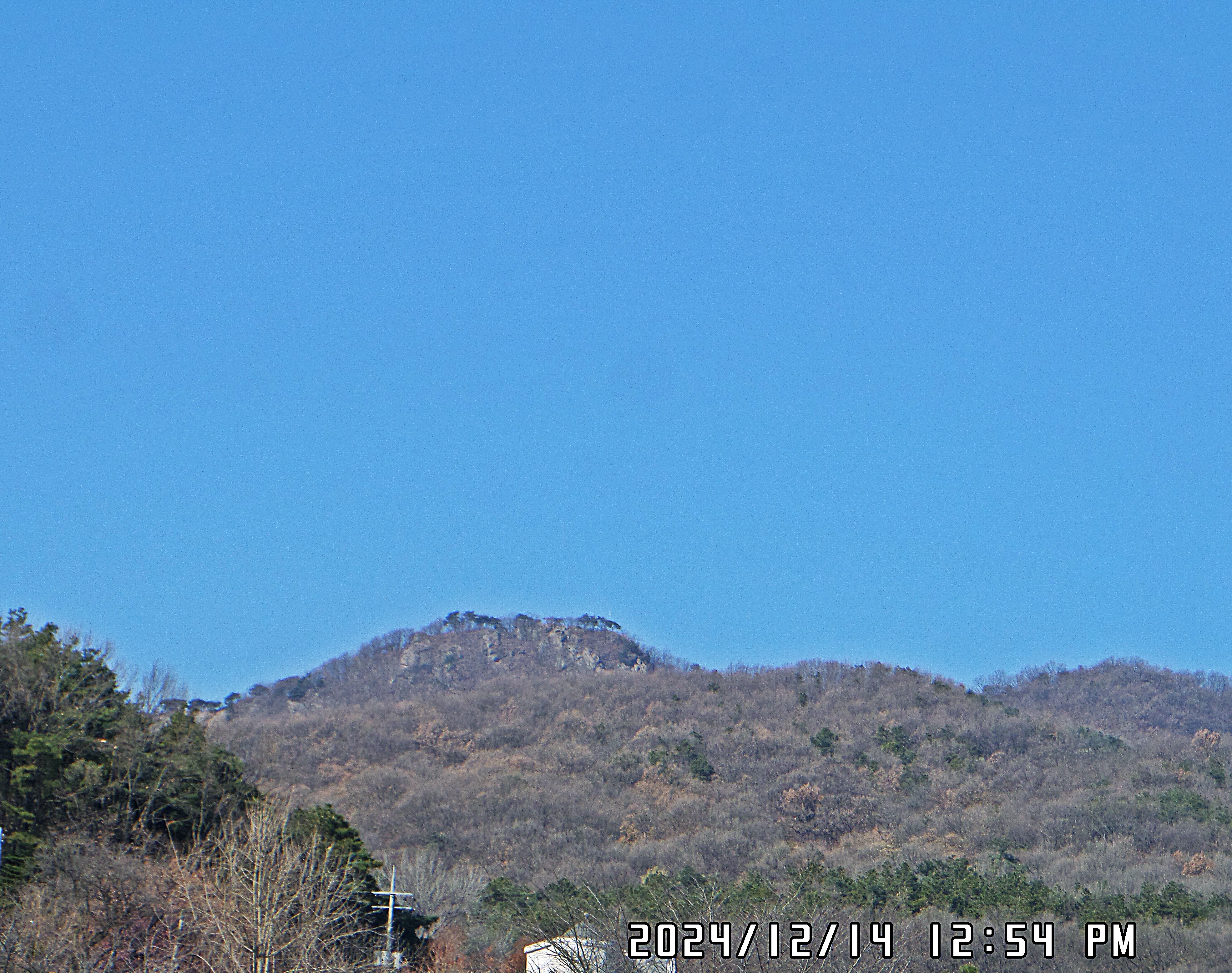 ▲오매기 마을 도로에 나와 모락산 정상부 줌인; 태극기가 우측에 흐리게 보인다