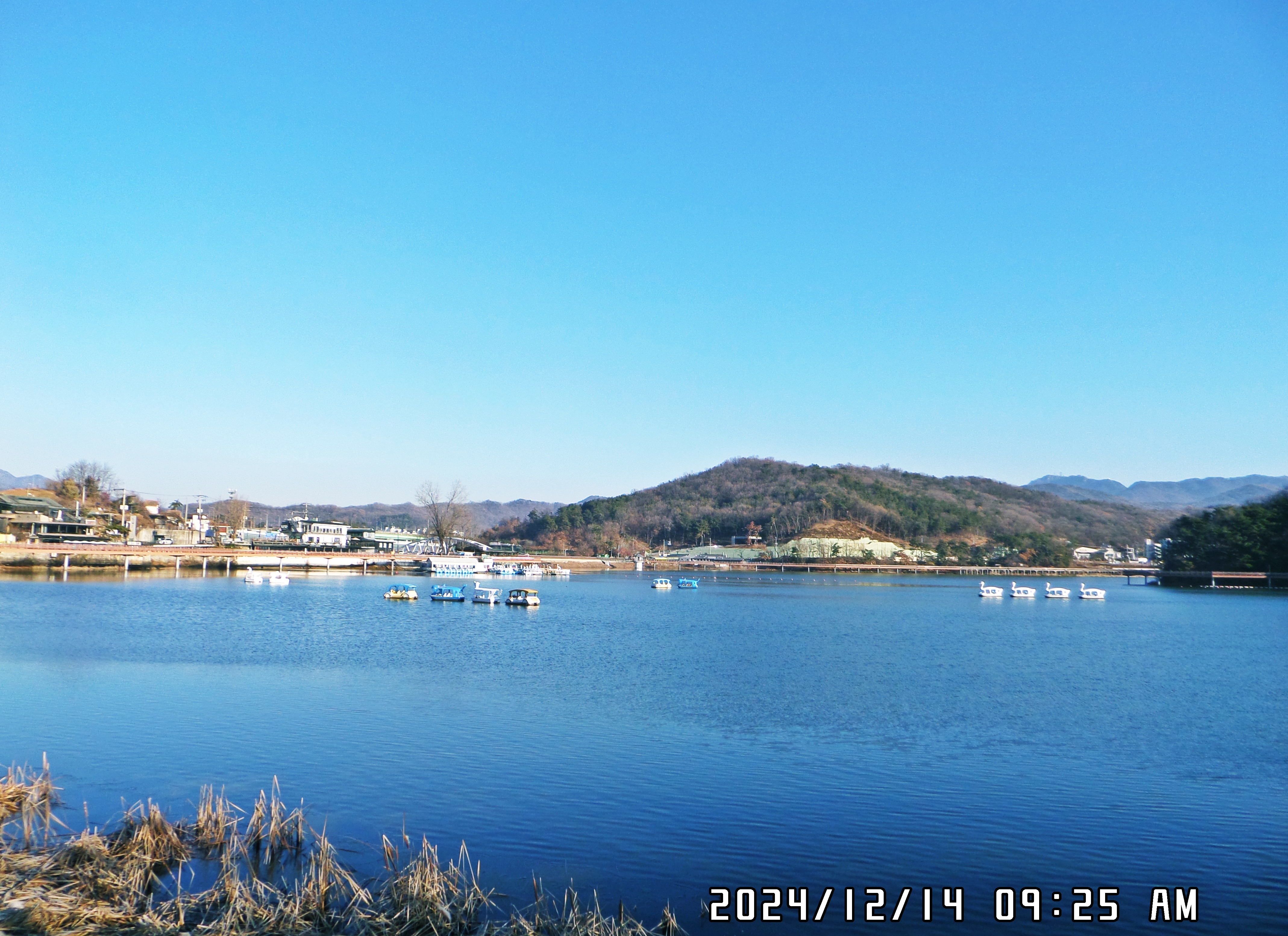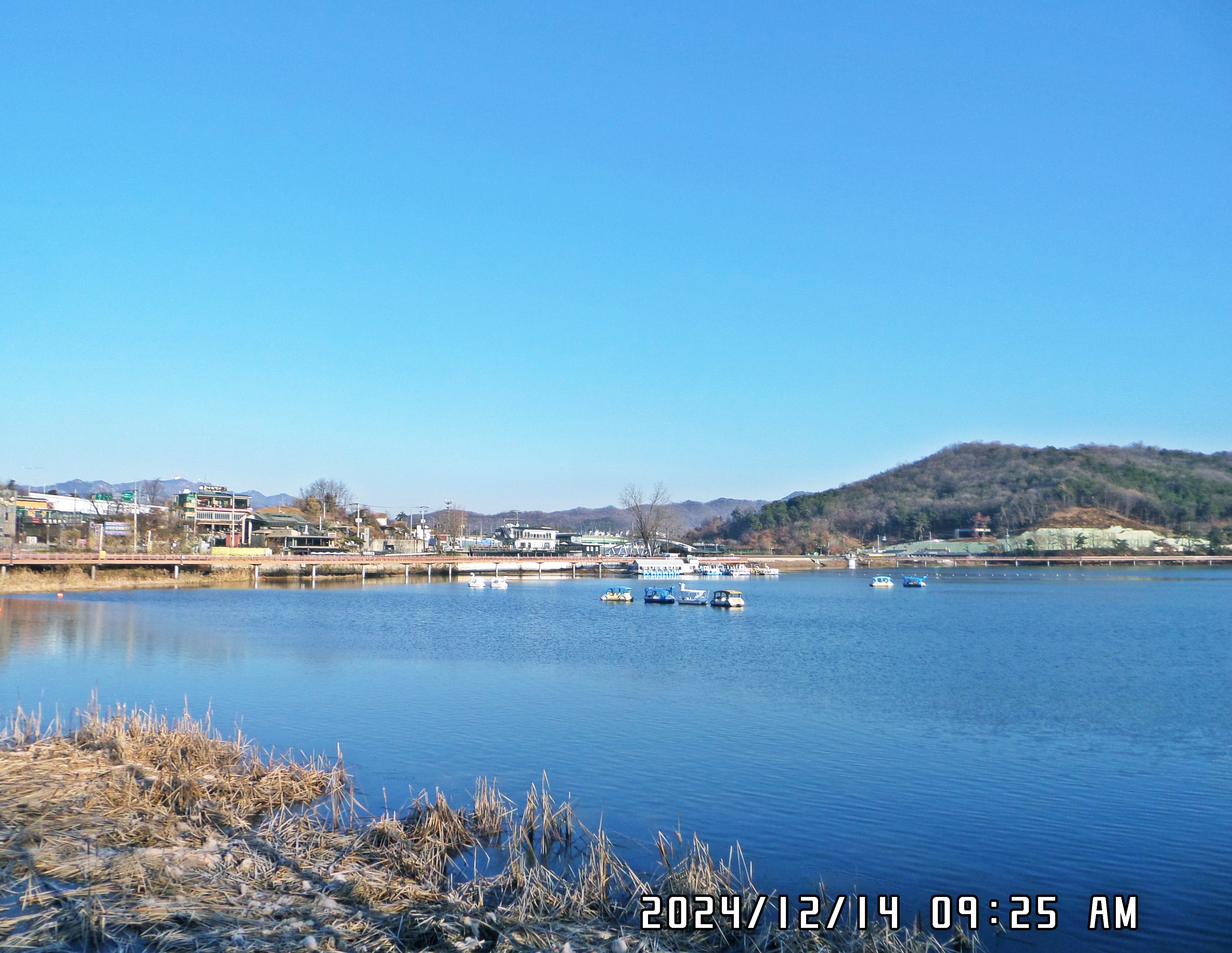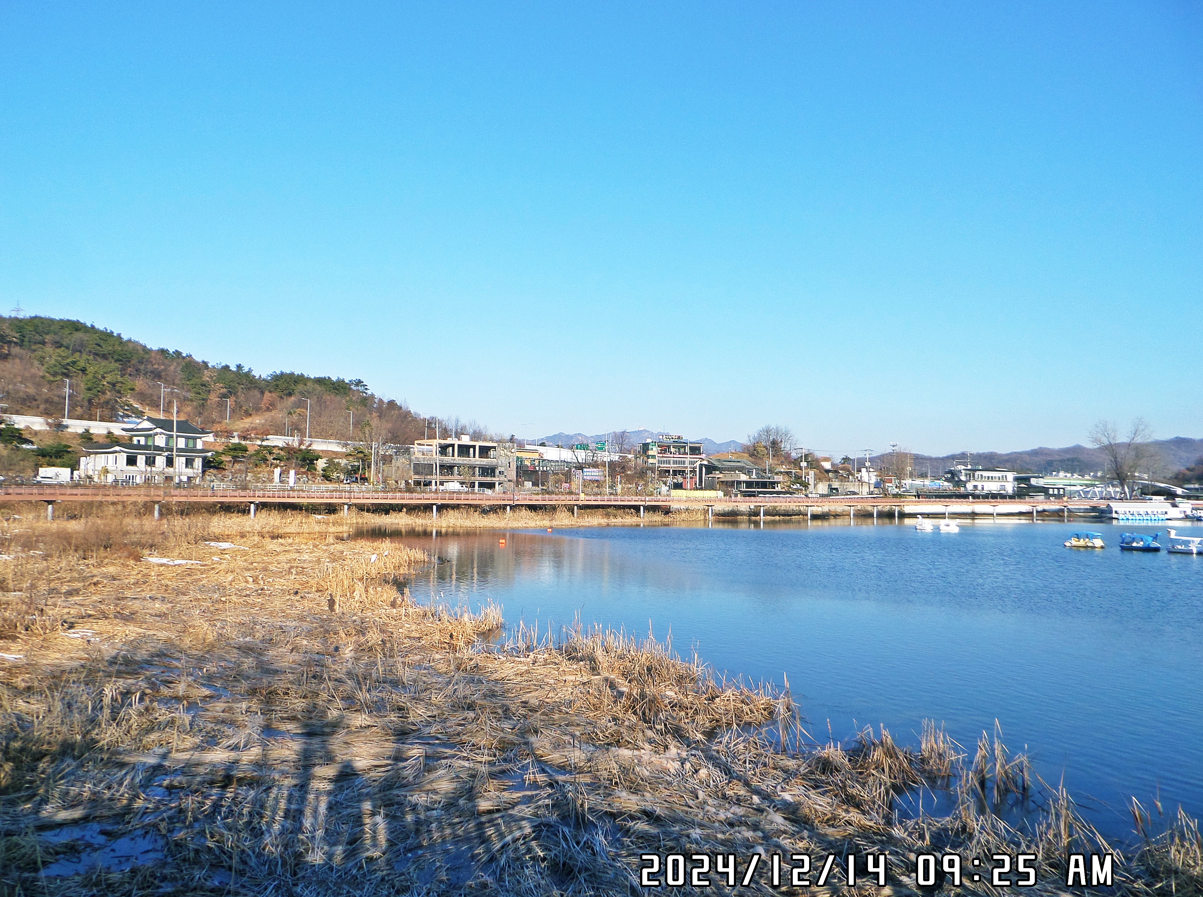 ▲호수위의 보트와 데크길, 그리고 수변 갈대가 그림을........