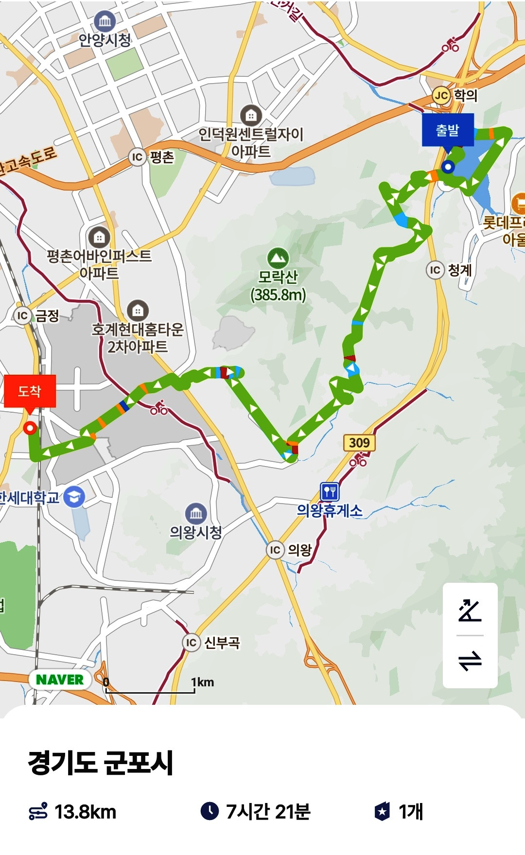 주추어탕(숲길입구)-정자-고천중뒷길-모락산둘레길입구(무궁화아파트4거리)-삼형제바위-의왕시설