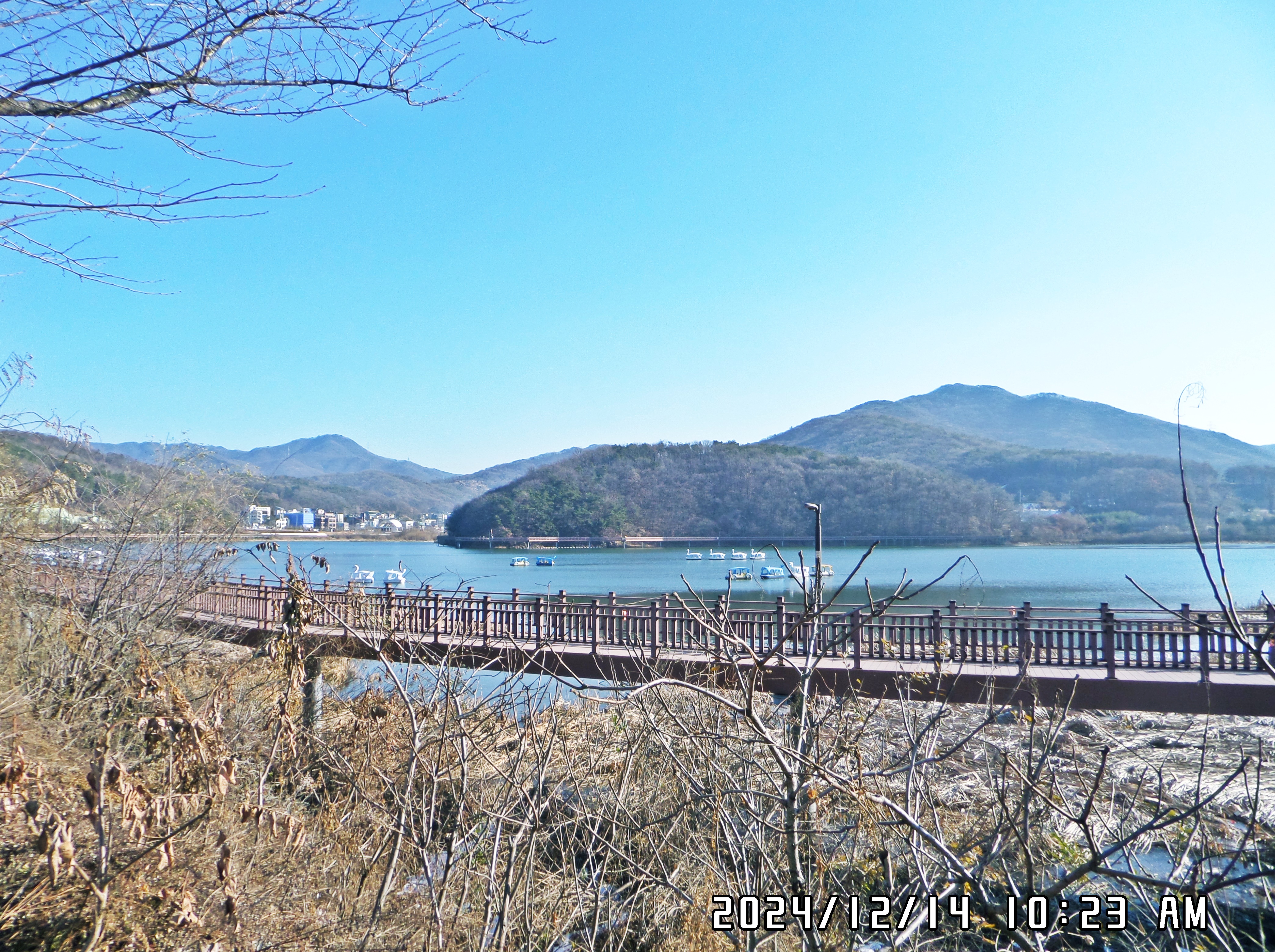 ▲진행방향으로 호수 수문의 아치교가, 그뒤로 모락산이 시야에 들어 온다