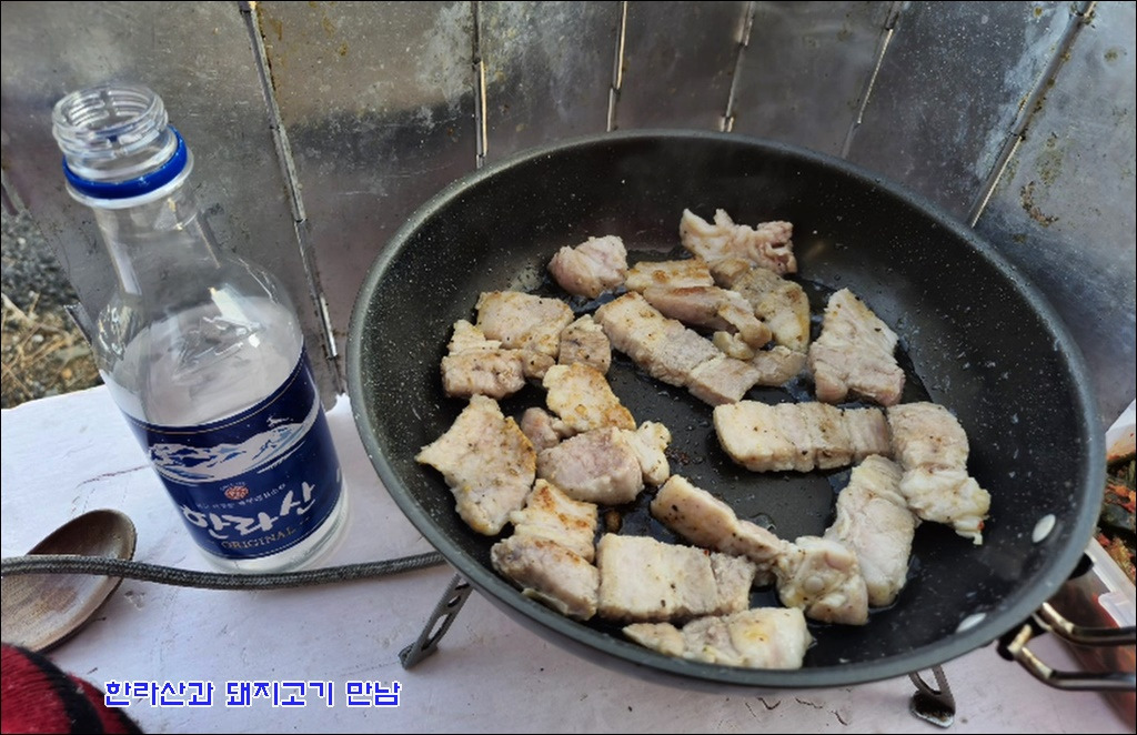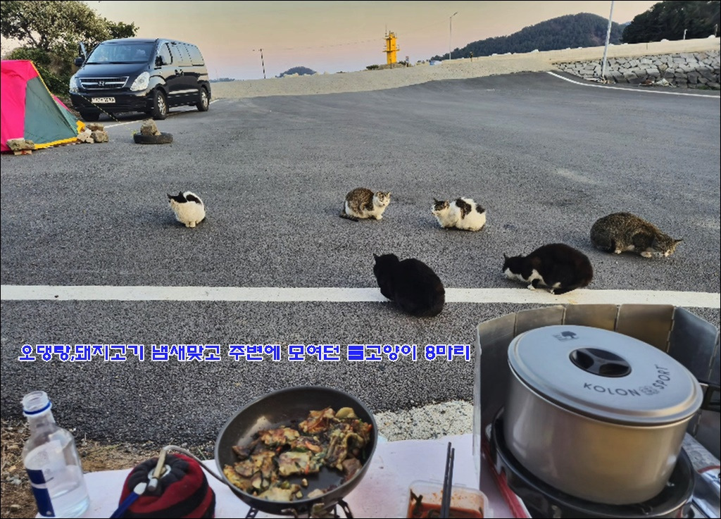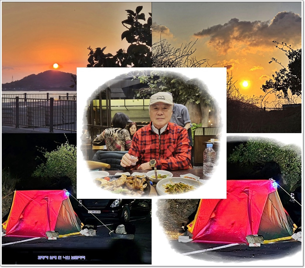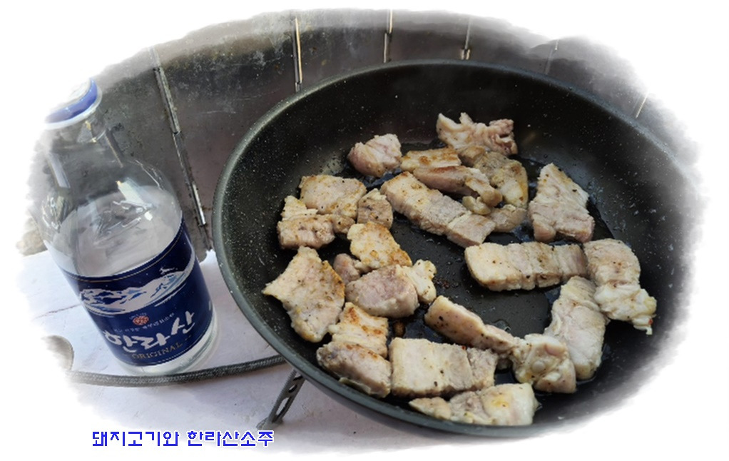 붉게 넘어가는 저녁노을 바라보면서 오댕탕과 돼지고기+한라산 한전하며 즐깁니다.