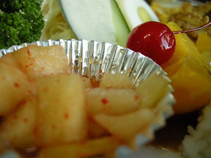 야채, 계란, 통조림 과일, 옥수수콘, 피클, 밥~