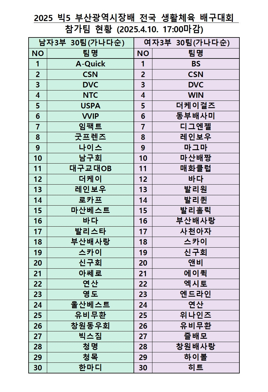 금일(2025.4.10. 17:00시)참가팀 접수를 마감하고 결과를 올려드리오니, 대회 일정에 참고하시기 바랍니다. 참가접수 확정팀에 대해서는 본 협회로부터 참가신청금 안내를 드릴것이며, 조편성과 대진표 등은 추후 공지하도록 하겠습니다. 아울러, 참가신청에 협조해주신 팀들은 물론, 일정이 맞지 않아 아쉽게도 다음기회로 미루신 팀들에게도 깊이 감사드리며, 건강한 모습으로 대회때 만나뵙기를 희망합니다.!! |