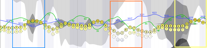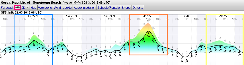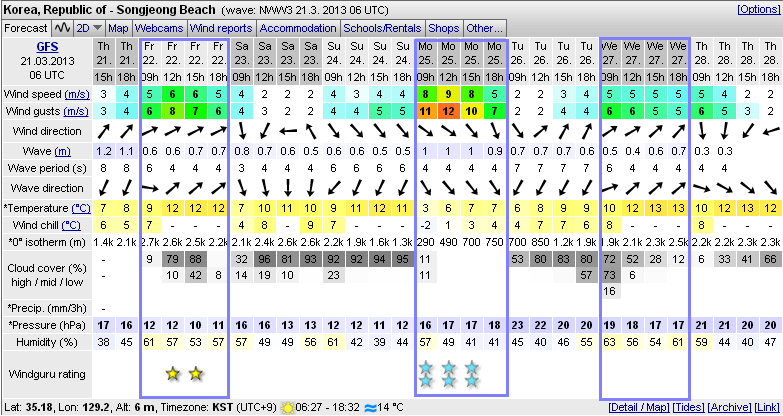 6~9~5m/s, 9~12~7m/s. 거스트 차도 크지 않고 정오 바람이 좋습니다. 수요일은 꾸준하게 부는 바람이죠? 하지만 기대를 가지고 기다리면 윈드구라windgura로 변합니다 ㅋㅋㅋㅋㅋ 2~3일 이내 예보는 쓸만한데 그 이상 예보는 그냥 그러려니 대강의 흐름만 짐작하시면 되겠습니다.