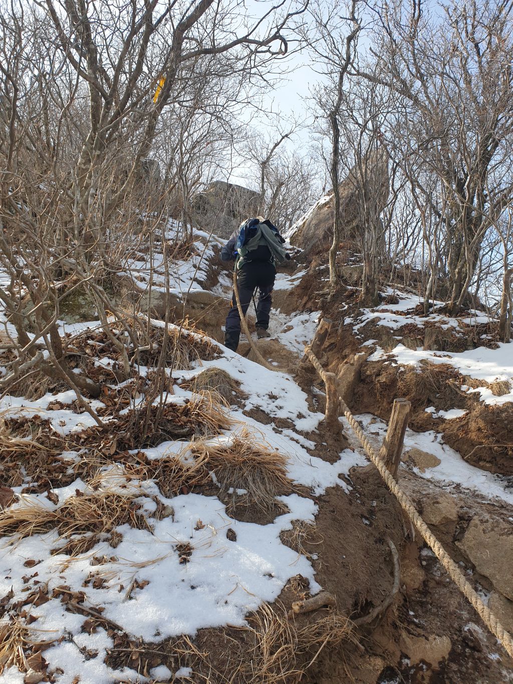 서봉에서 남덕유산까지는 아직 눈이 조금 남아있고 얼어서 미끄러운 길이 이어집니다
