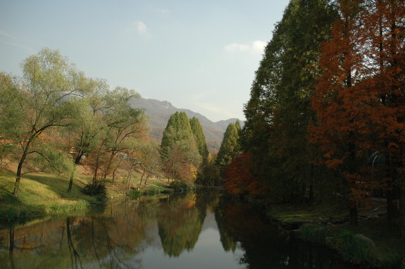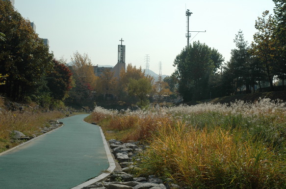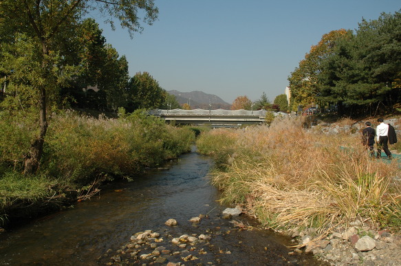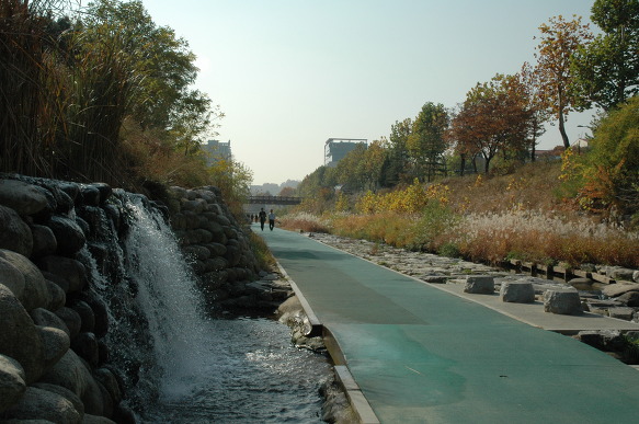 냇물도 하늘도 나무들도 한창 가을을 타고 있습니다....... 사람들은 물론이거니와...... 왼쪽에 쏟아지는 물은 인공폭포가 아니고 지하철에서 나오는 침출수라는군요...