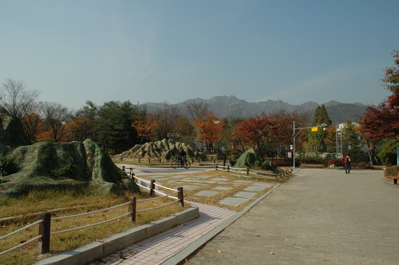 과천 중앙공원에서 본 관악산, 앞에 산처럼 만들어놓은 모형물은 과천을 둘러싸고 있는 산들을 축소한 모형입니다. 왼쪽 청계산, 중간 관악산, 오른쪽 독도처럼 작은 놈은 우면산