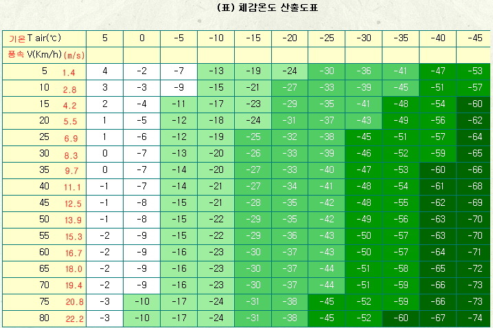 기상청 체감온도표 작성자산쟁이|작성시간13.12.26|조회수1,817 목록 댓글 0 글자크기 작게가 글자크기 크게가 기상청 체감온도표라고 합니다.동계 야영및 산행시 도움될까해?올여봅니다. 참조하세요.^^ 다음검색 현재 게시글 추가 기능 열기 북마크 공유하기 신고 센터로 신고 댓글 댓글 0 댓글쓰기 답글쓰기 댓글 리스트