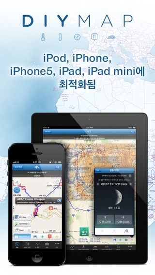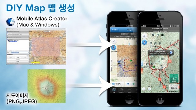 많은 분들이 사용하는 유명한 지도 생성 프로그램인 Mobile Atlas Creator(http://mobac.sourceforge.net) 로 다운받은 지도를 DIY Map GPS 앱에서 사용할 수 있습니다. 또한 스캔한 지도 이미지를 가지고 있다면 이 지도 이미지를 이용해서 나만의 DIY Map을 만들 수 있습니다.