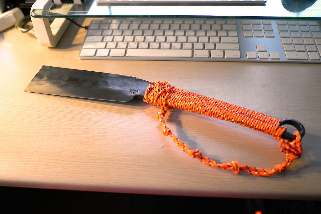 감았다. 전체적으로 무게감을 느낄 수 있도록 만들었으며, 손잡이 뒷부분에 고리를 만들어 날이 이탈되지 않도록 하였다.