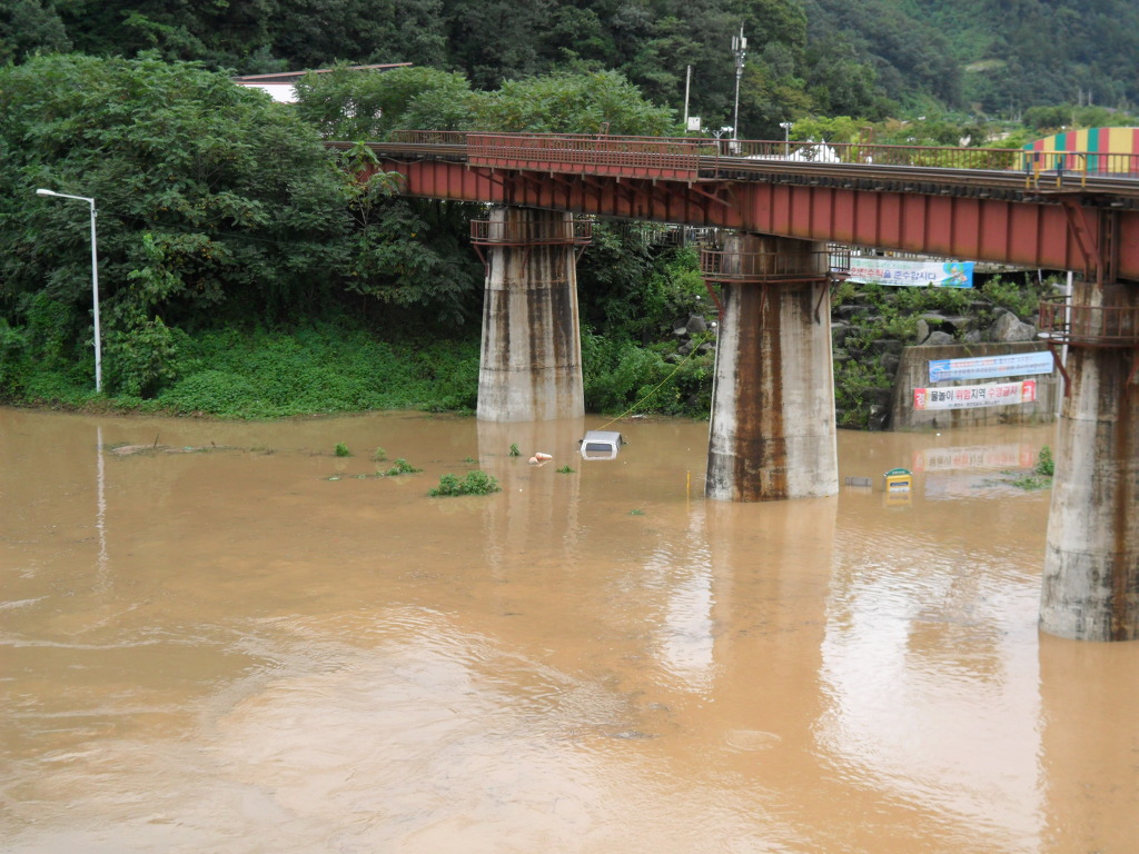 춘천지역을 중심으로 집중호우가 내려 비 무지하게 많이 왔다고 하네요..하상도로에 차량한대가 밧줄에 의지하고 있습니다.