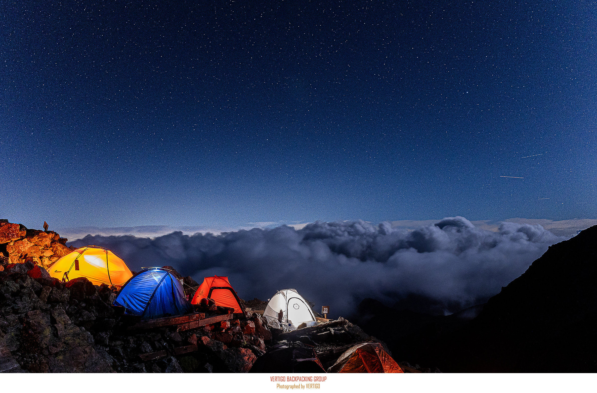 들머리 비지터센터에서 만난 닛뽄 사람은 올라가면 죽는다며 극구 우리를 말렸지만 우리는 야간 산행으로 4시간에 걸쳐 러쎌을 하면서 어렵게 야영지까지 올라간다.