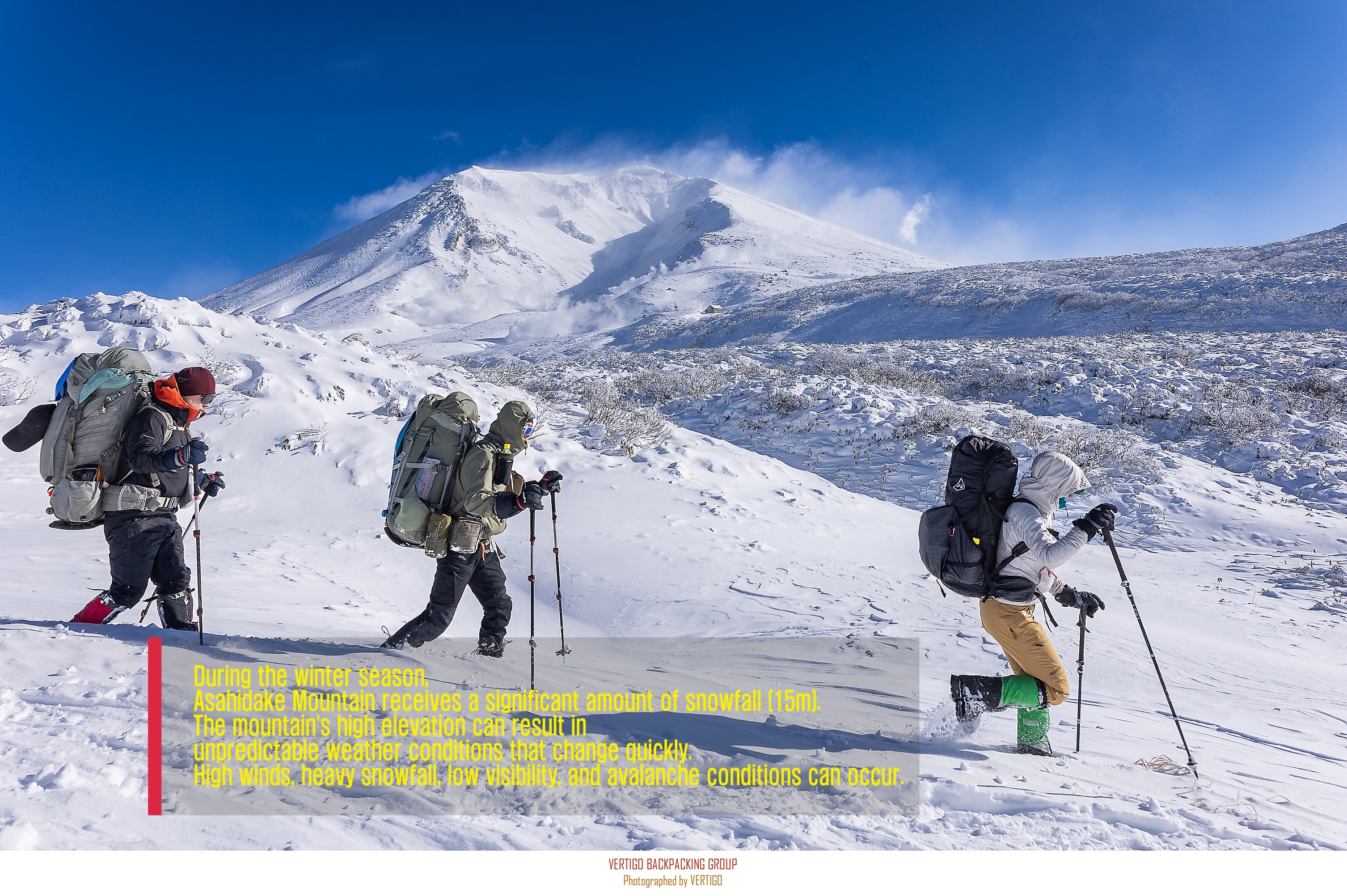 아사히다케(2,291m) 주봉이 보이는 멋진 설원을 걷는 단원들^^