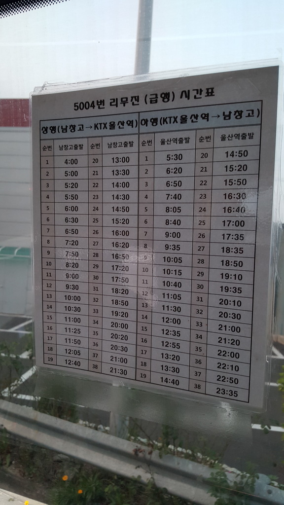 울산광역시 KTX울산역 리무진 중 5004번 버스의 시간표입니다. 울산은 KTX울산역 개통과 동시에 적극적으로 리무진버스를 신설하여 비교적 성공적으로 운행하고 있습니다. 5004번은 남창에서 출발, 공업탑-신복로터리를 경유하는데 울산 주요 지역을 지남에도 의외로 다른 노선보다 탑승률이 낮은 편이라고 합니다.