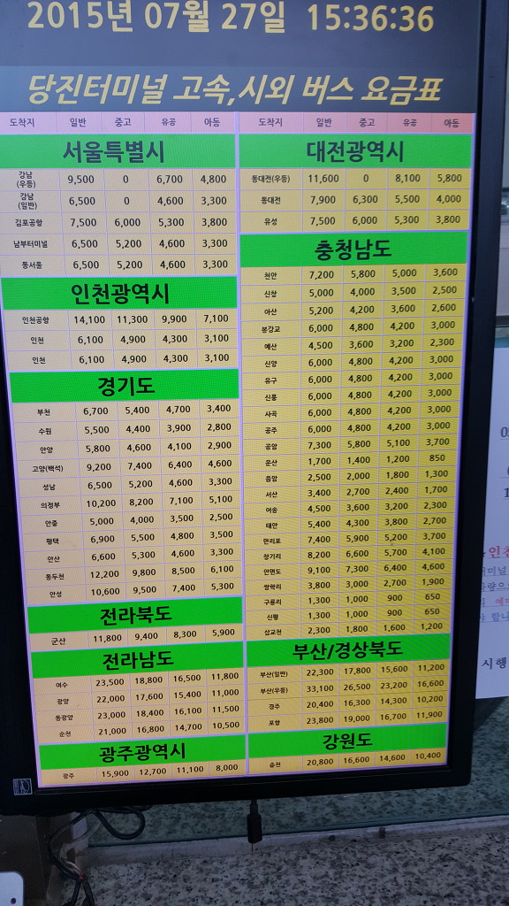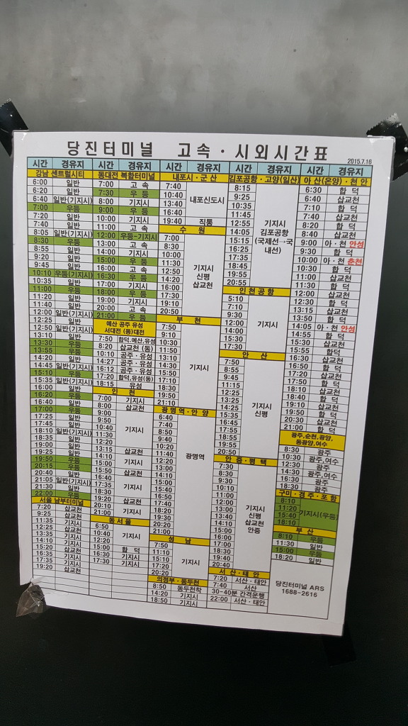 당진종합터미널 시간표입니다. 서해안고속도로의 개통은 당진 시외교통 개선에 혁혁한 공을 세웠죠. 서울행만 일 58회(무정차,완행 포함)가 운행되고 있고, 그 외에도 오히려 수도권 노선이 충남 타 지역을 잇는 노선보다 발달한 상황입니다.
