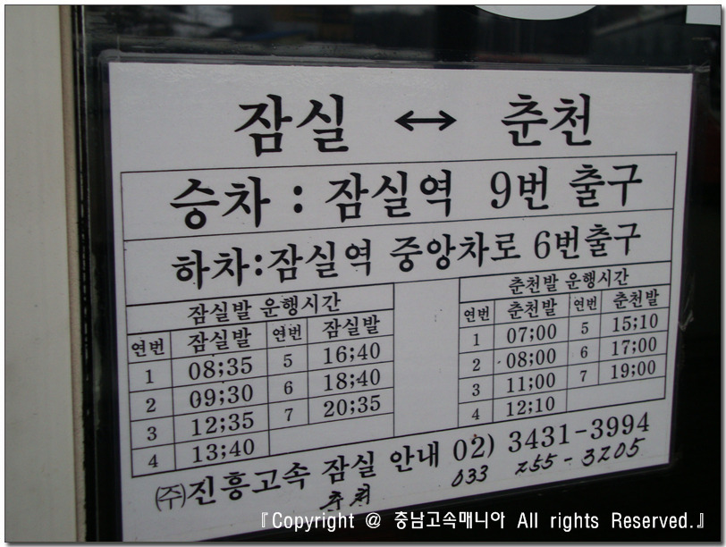 답댓글 작성자(주)진흥고속 작성시간 11.02.17 요금은 성인 6,400원 청소년 4,500원 입니다...잠실역 9번출구 승차장에서 출발 무정차 춘천 시외버스 터미널로 도착합니다...^^ 고맙습니다.....