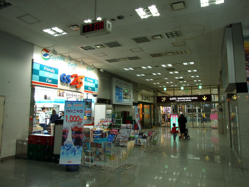 왼쪽으론 하차장이, 오른쪽으론 출구와 매표소(2층)-쇼핑센터(지하)로 이어지는 에스컬레이터가,