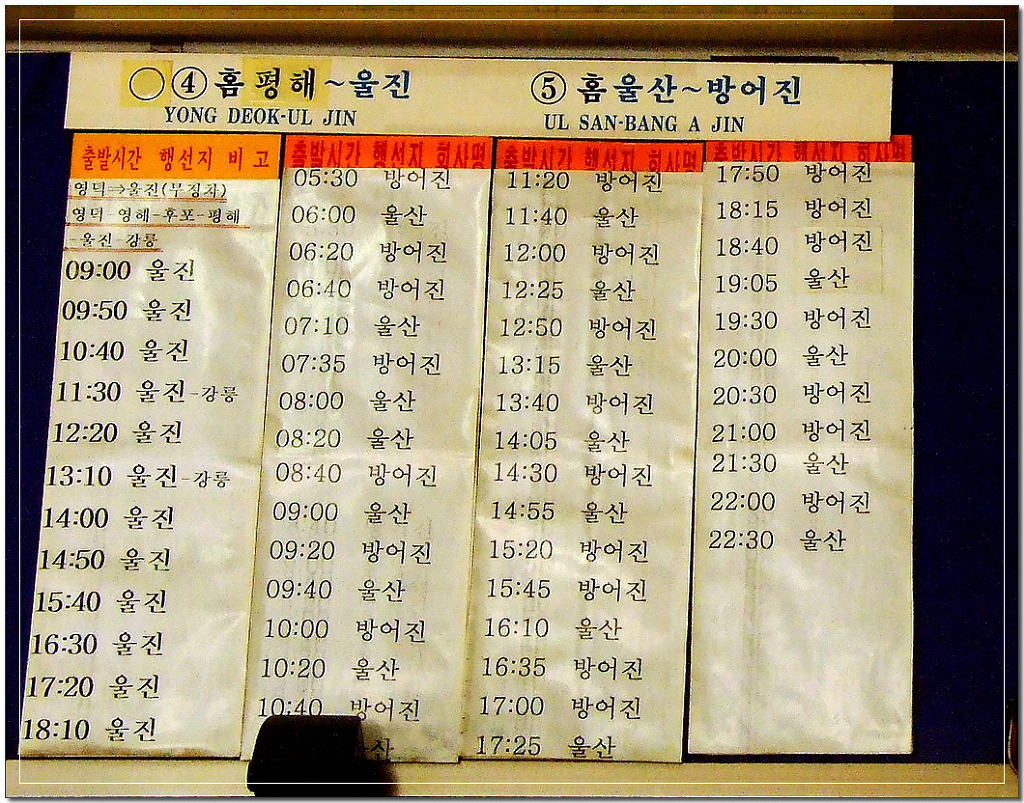 이것도 자가용 기준으로, 버스로는 울진 직행이 3시간, 완행은 4시간 30분이 걸린다. 서울과도 거의 맞먹을 정도다!