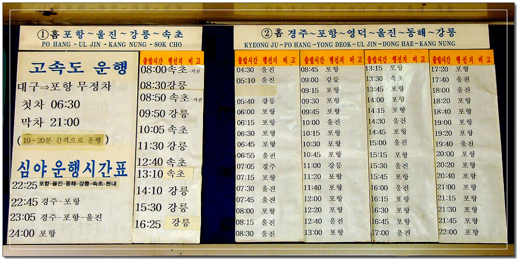 주 노선은 포항행 무정차 노선으로 거의 시내버스처럼 자주 오기 때문에(10~20분 배차) 굳이 출발시간을 붙여놓지 않았다.